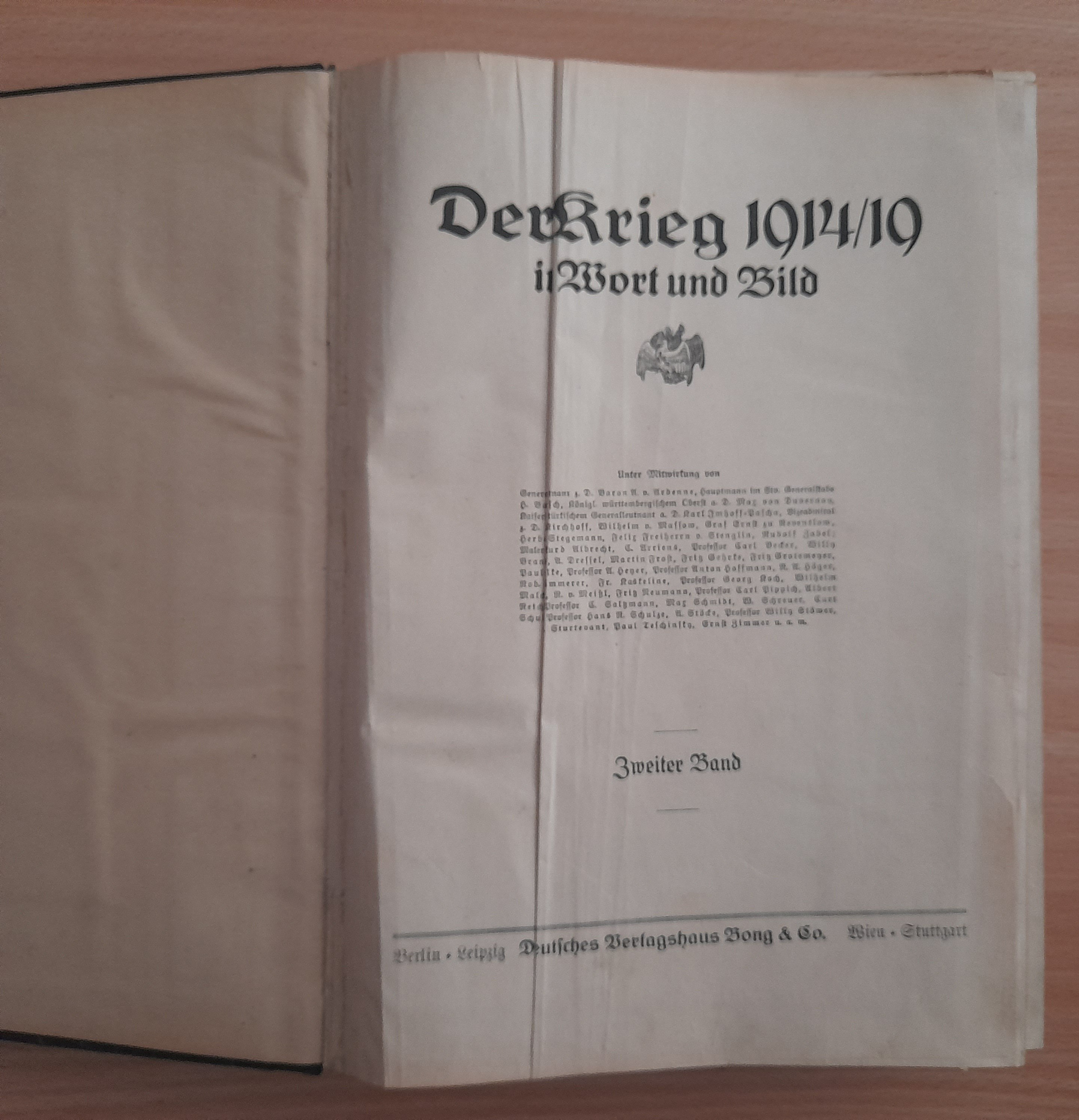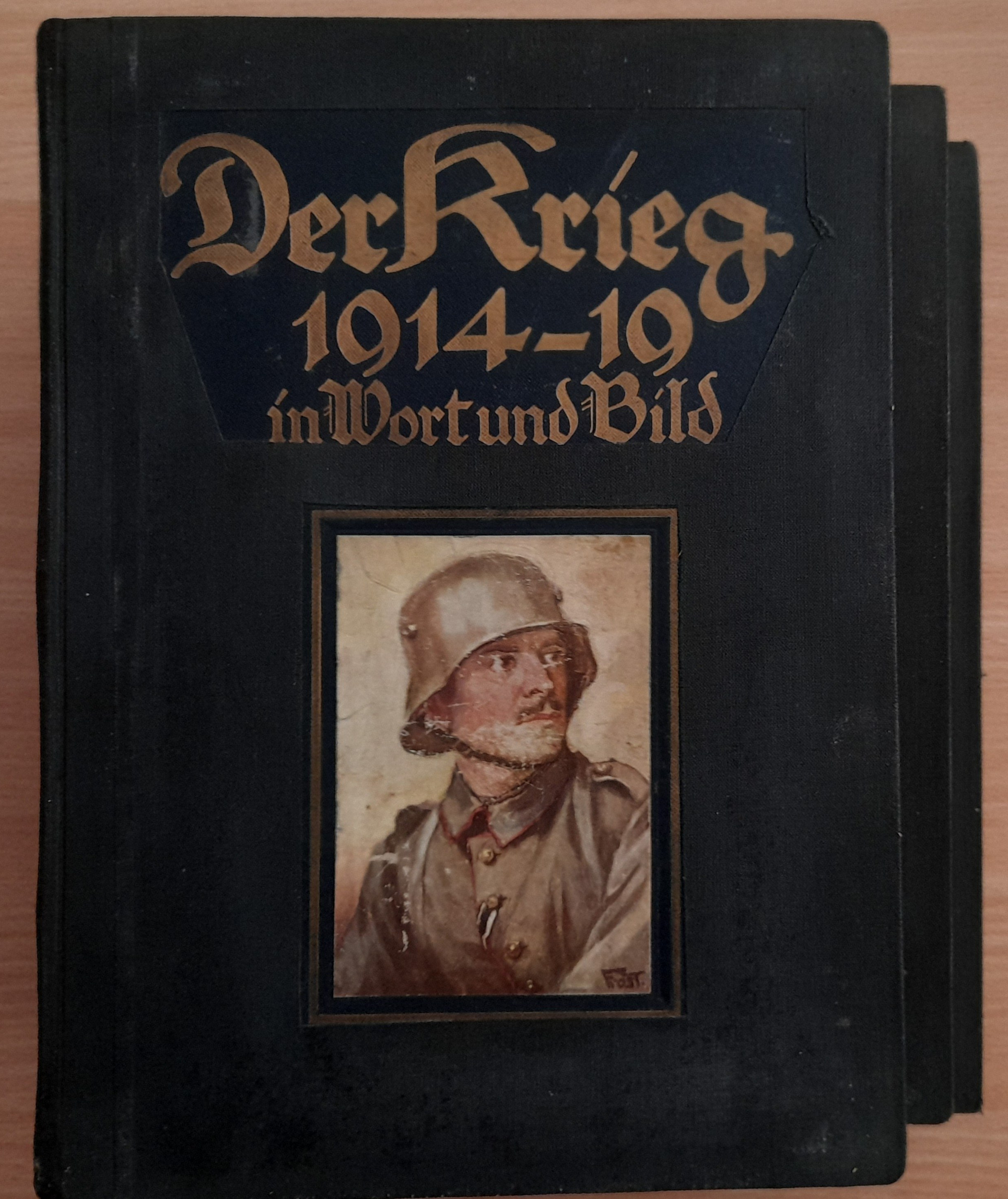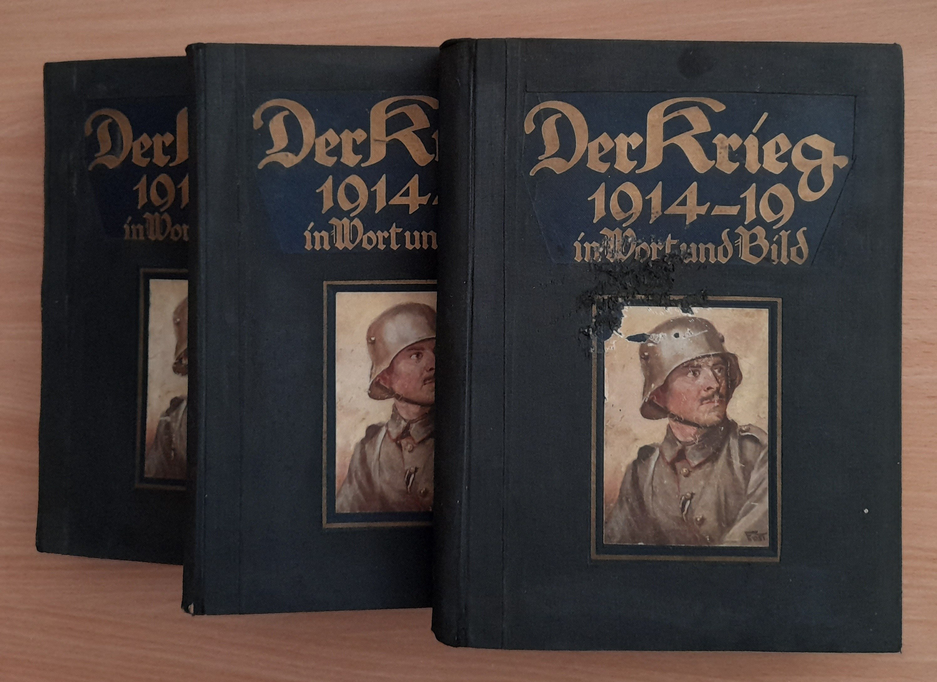 Der Krieg 1914/19 in Wort Und Bild. Tom 1/3, Berlin – Leipzig [1919] Wyd. Deutsches Verlagshaus Bong &Co, str. II, 1830 (paginacja wspólna dla trzech tomów), liczne ilustracje + rozkładane tablice, opr. oryg. pł. zdobiona 30cm /w tomie 3 brak karty tytułowej/
