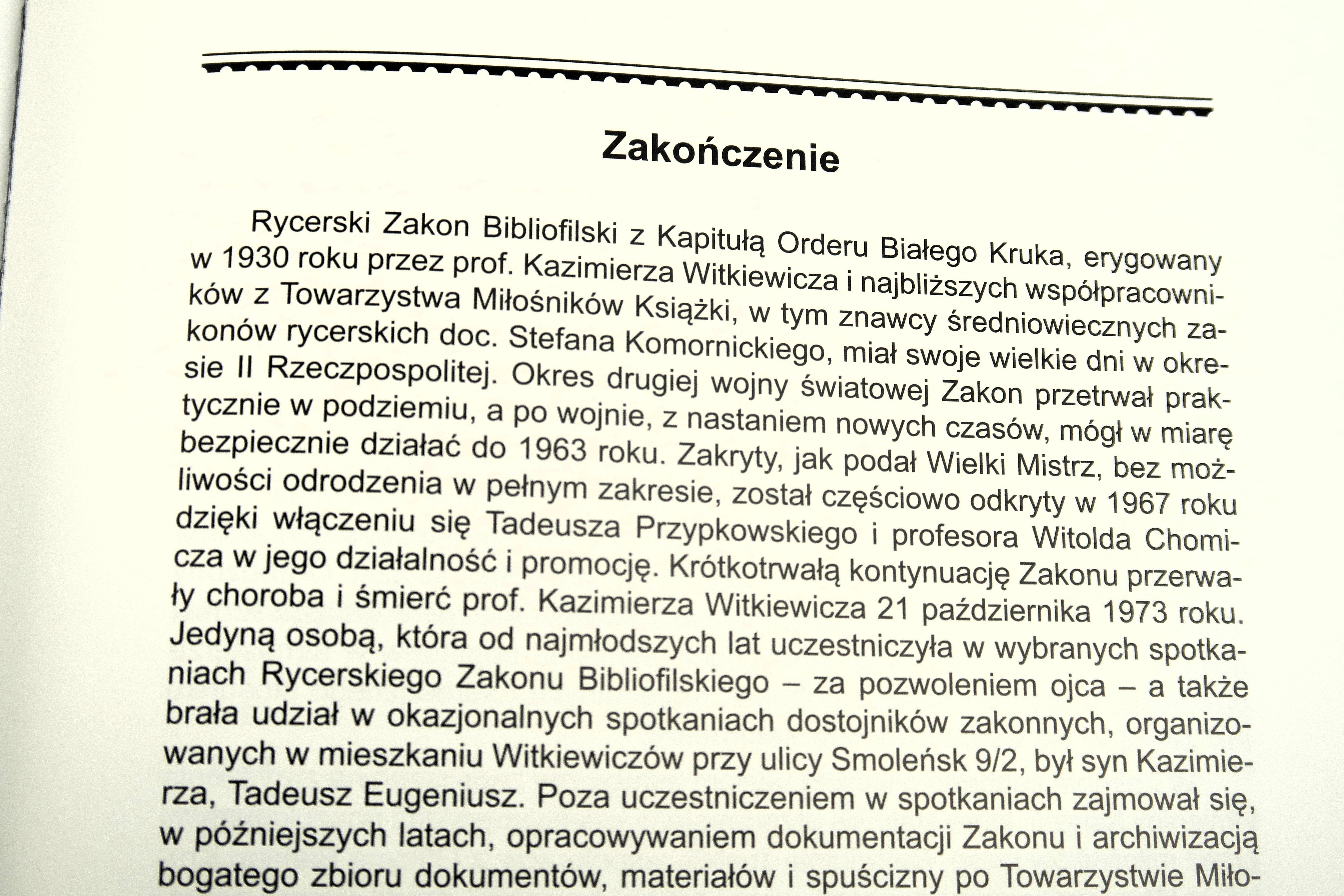 Rycerski Zakon Bibliofilski z Kapitułą Orderu Białego Kruka w Krakowie rozpoczął swoją działalność 13 lutego 1930 r. Jego pomysłodawcą był Kazimierz Wojciech Witkiewicz (1880-1973), prezes Towarzystwa Przyjaciół Książki i późniejszy dyrektor Muzeum Przemysłu Artystycznego w Krakowie. Czytelnia Muzeum, wraz z biblioteką oraz gabinetem Witkiewicza stały się siedzibą Rycerzy Książki. Opracował on hierarchię godności, tytulaturę, ceremoniał, a także zaprojektował wszystkie warianty Orderu Białego Kruka. Zakon w okresie międzywojennym aktywnie działał na rzecz bibliofilstwa w kraju i na świecie. Wraz z nadejściem II wojny światowej bibliofile zrzeszeni w Zakonie musieli zaprzestać dotychczasowych form intensywnej aktywności. Był to czas prowadzenia działalności konspiracyjnej. Niestety również czasy powojenne nie były łaskawe dla Zakonu. Nowe władze niechętnie patrzyły na elitarny charakter organizacji. Z tego powodu 1963 roku Kazimierz Witkiewicz zdecydował się zawiesić działalność Kapituły Orła Białego.