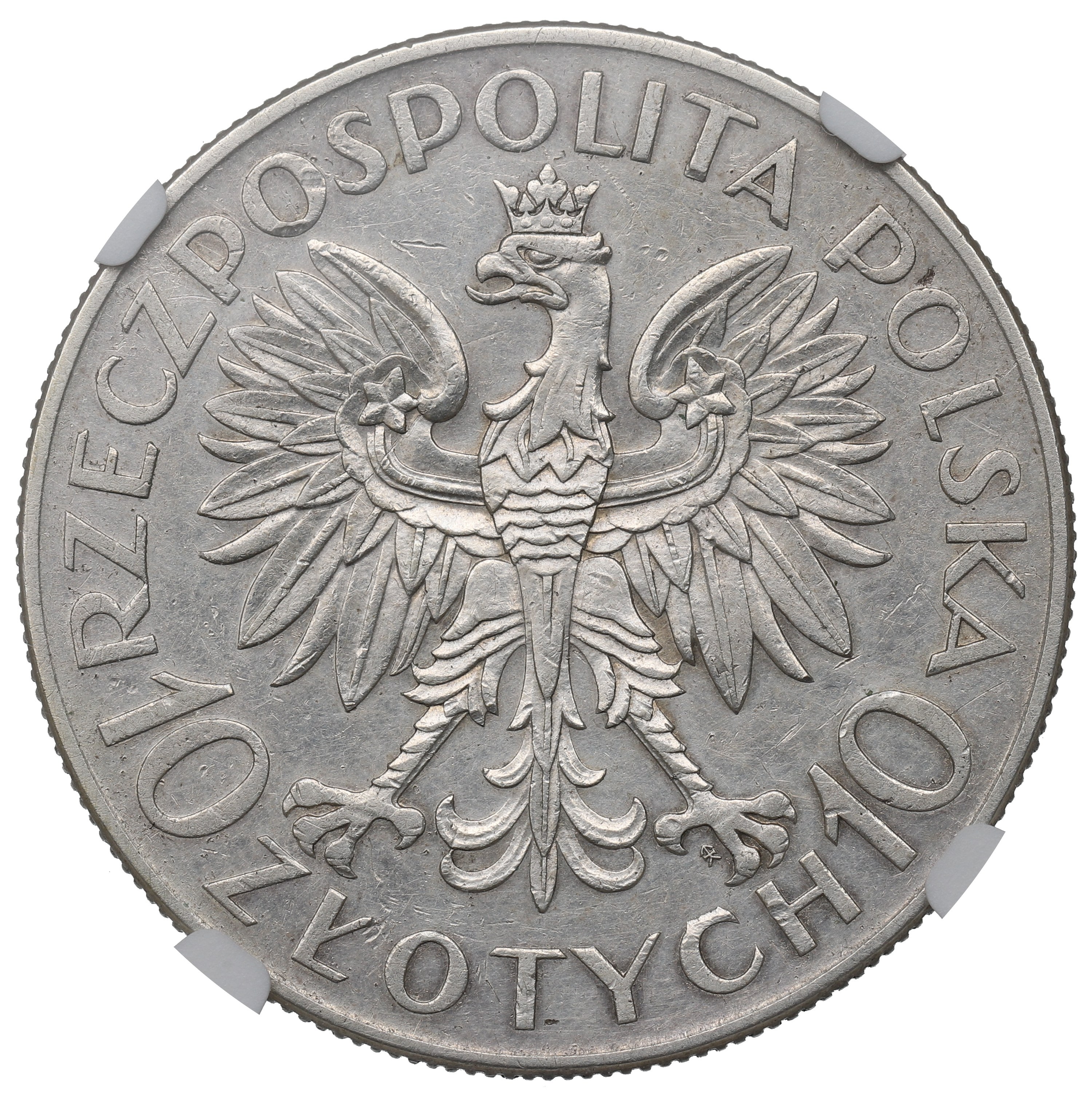 Awers: orzeł państwowy wzoru z 1927 roku, w otoku napis: RZECZPOSPOLITA POLSKA 10 ZŁOTYCH 10, pod łapą orła herb Kościesza – znak Mennicy Państwowej w Warszawie.