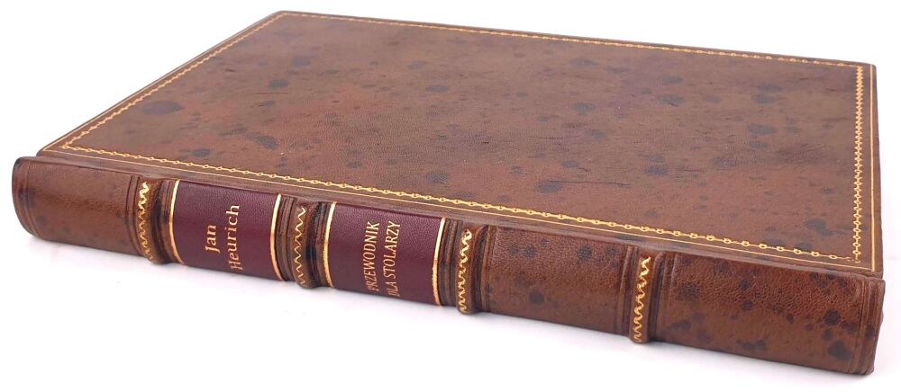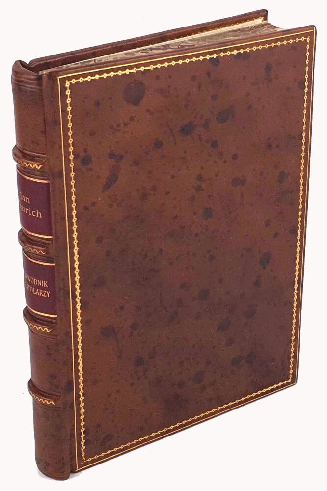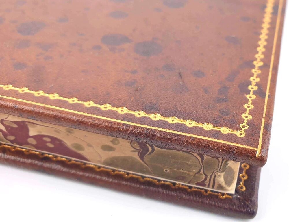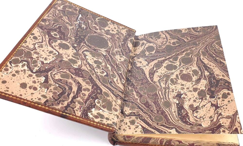 TWARDA OPRAWA PEŁNA SKÓRA WSPÓŁCZESNA RĘCZNIE MARMORYZOWANA, OKŁADKI OKOLONE ZŁOCONĄ BORDIURĄ, GRZBIET Z PODZIAŁEM NA POLA Z WYPUKŁYMI ZWIĘZAMI PODKREŚLONYMI ŚLEPYMI TŁOCZENIAMI, DWA BARWNE SZYLDZIKI ZE ZLOCONĄ TYTULATURĄ PODKREŚLONĄ PODWÓJNĄ ZŁOCONĄ LINIĄ, OBCIĘCIA KART MARMORYZOWANE, WYKLEJKI Z RĘCZNIE BARWIONEGO W MASIE PAPIERU MARMURKOWEGO. WNĘTRZE OKŁADEK WYKOŃCZONE ZŁOTYM SZLACZKIEM.
