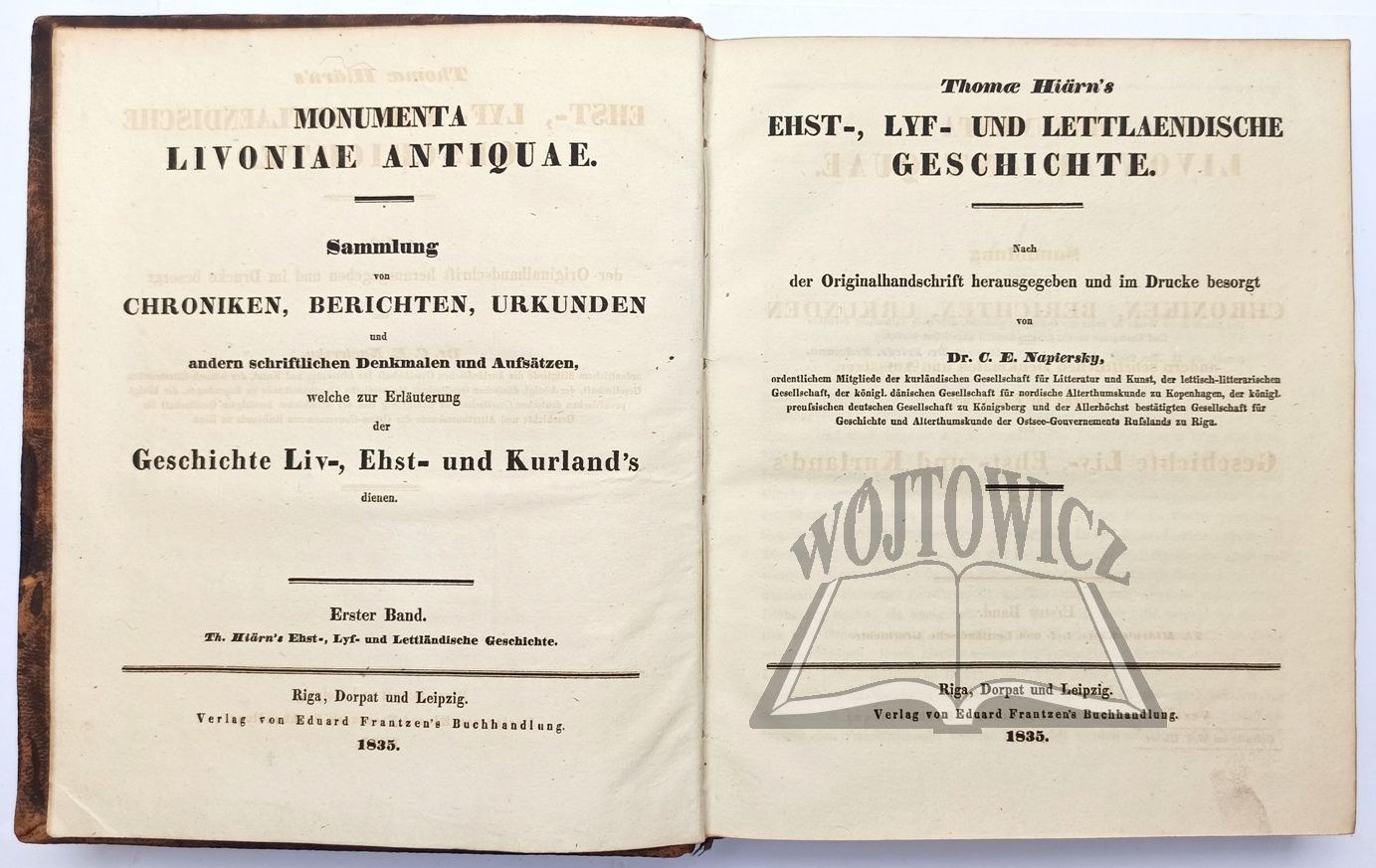 Nach der Originalhandschrift herausgegebn und im Drucke besorgt von Dr. C. E. Napiersky. Riga, Dorpat und Leipzig 1835. Verlag von Eduard Frantzen's Buchhandlung. 8 (duża), s. XVI, 444, opr. sk. z epoki, złoc. zdobienia. Monumenta Livoanie Antiquae. Sammlung von Chroniken, Berichten, Urkunden andern schriftlichen Denkmalen und Aufsätzen, welche zur Erläuterung der Geschichte Liv-, Ehst- und Kurland's dienen. Erster Band.