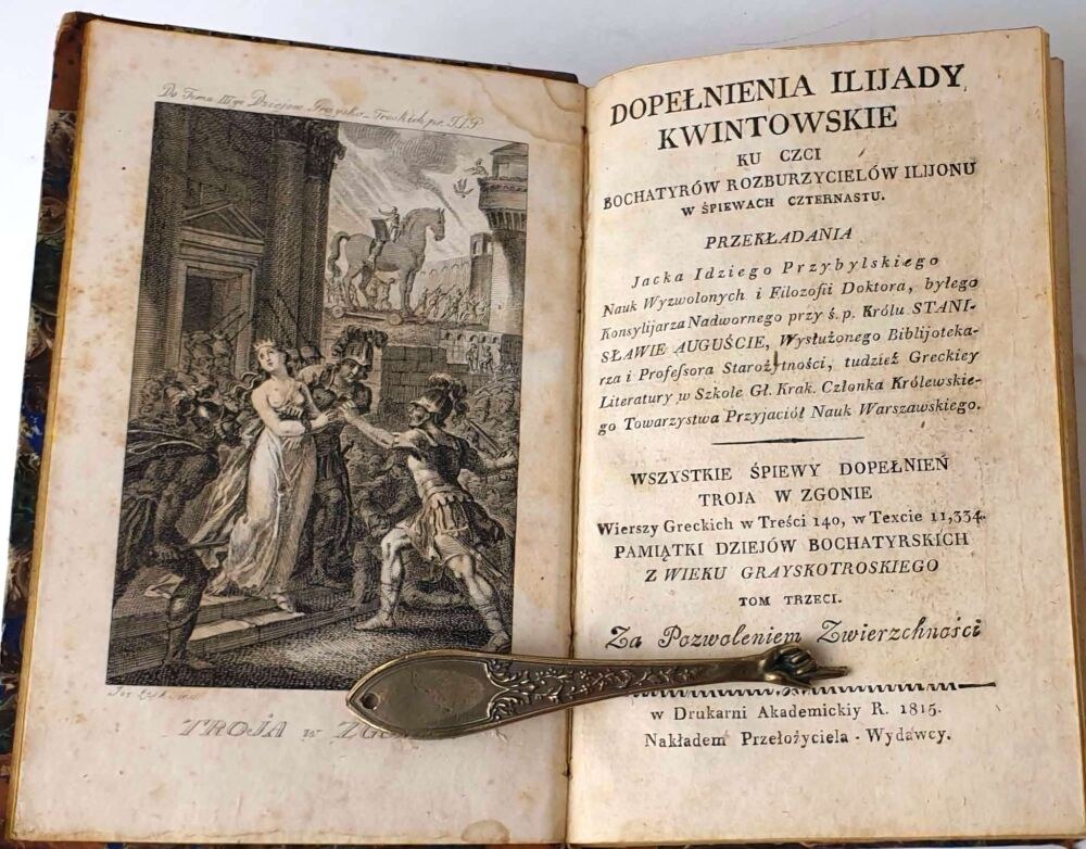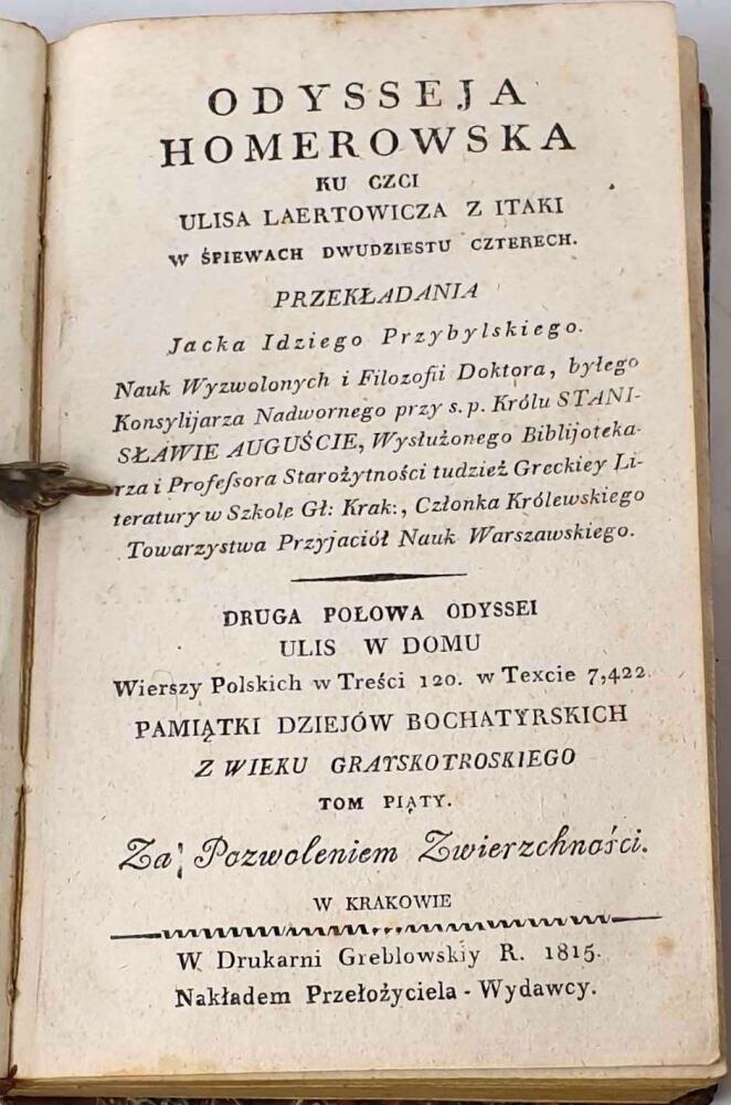 Dwa eposy starogreckie w przekładzie Jacka Przybylskiego, który swoją pracę zadedykował w druku "Naypotężnieyszemu Miłościwemu Panu Alexandrowi I. Imperatorowi Wszech Rossyy". Wariant bez ilustracji.