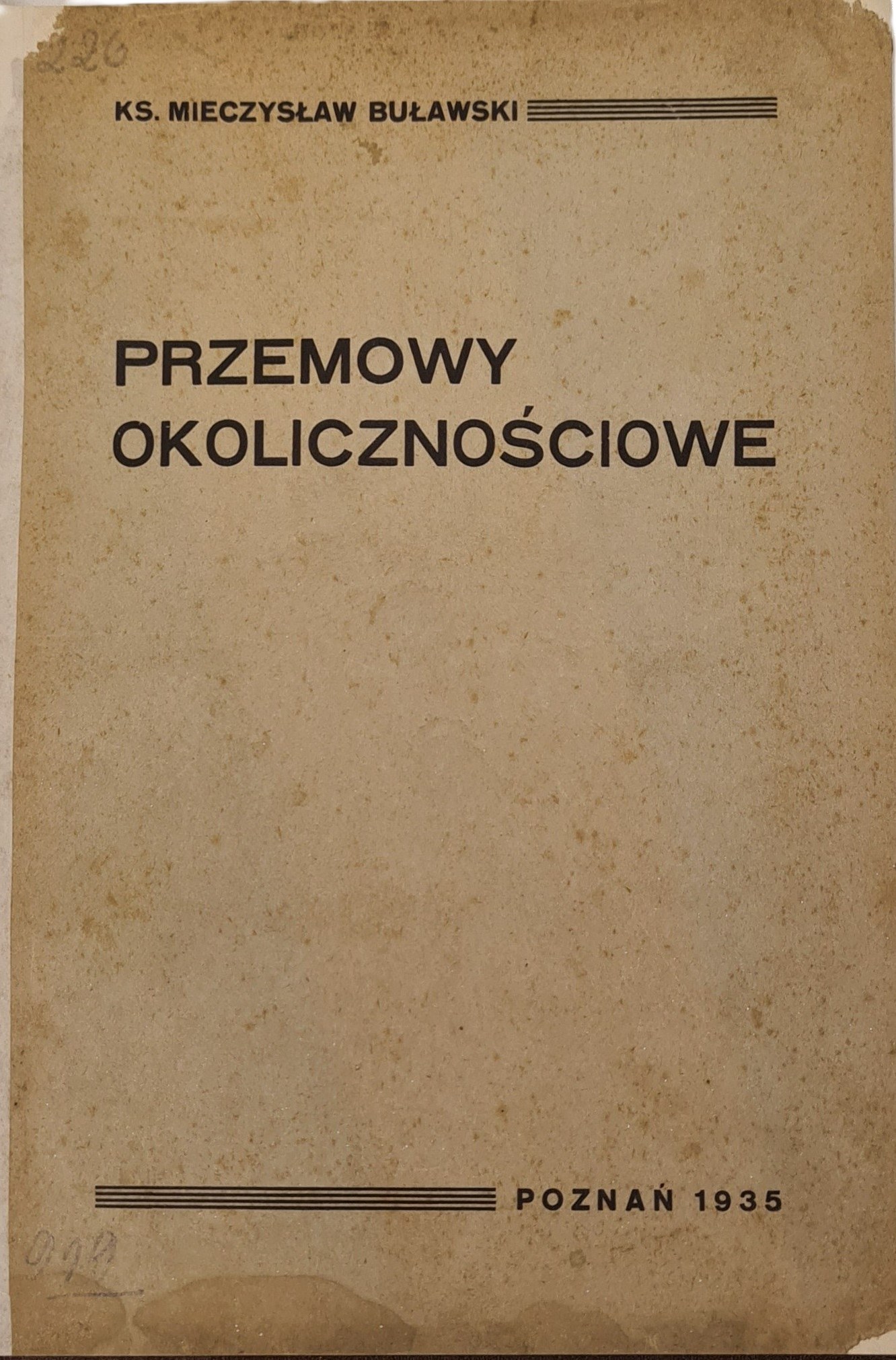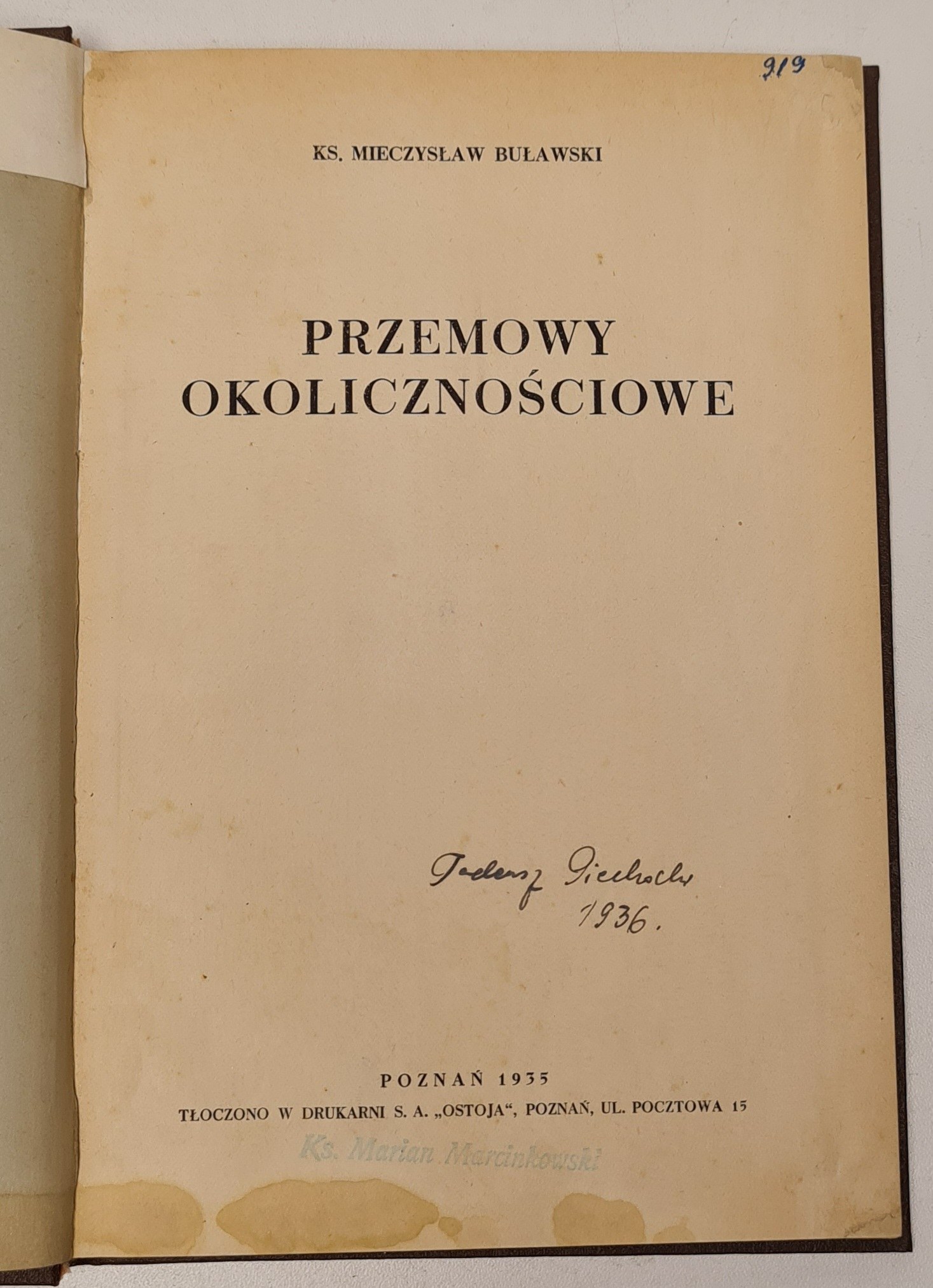 Buławski Mieczysław - Przemowy okolicznościowe, Poznań 1935, Drukarnia S.A. "Ostoja" . wym. 15,5x22,5cm. s.167. Opr. introligatorska ze złotym tytułem na grzbiecie. Na wyklejce ex libris Z. St. Bocianowskiach. zawiera oprawę wydawniczą. na str. tyt. odręczny podpis własnościowy i pieczątka. Plamy na dołach s. 1-17. Stan dobry