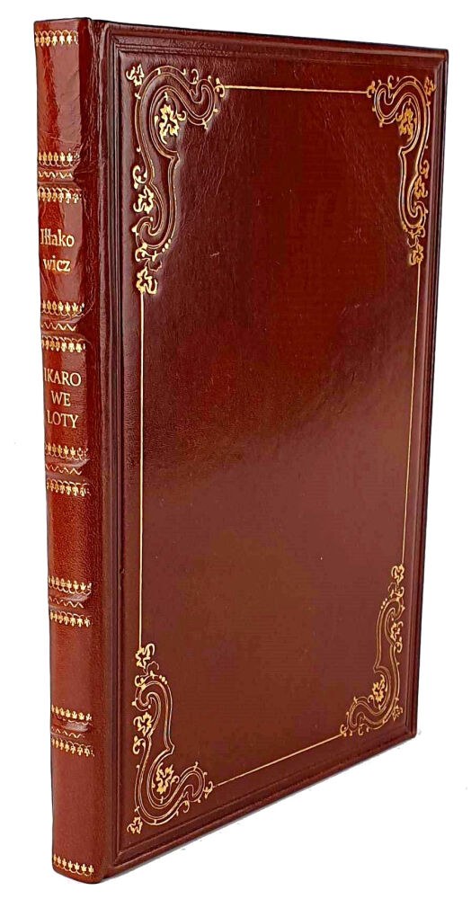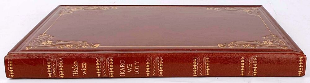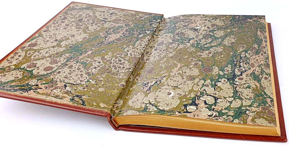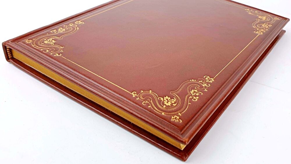 TWARDA OPRAWA PEŁNA SKÓRA WSPÓŁCZESNA . OKŁADKI Z EFEKTOWNĄ TŁOCZONĄ NA ŚLEPO I ZŁOTO BORDIURĄ. GRZBIET Z WYPUKŁYMI ZWIĘZAMI, TŁOCZENIAMI I ZŁOCENIAMI. WYKLEJKIE MARMORYZOWANE, WNĘTRZA OKŁADEK WYKOŃCZONE ZŁOCONYM SZLACZKIEM. OBCIĘCI KART ZŁOCONE.