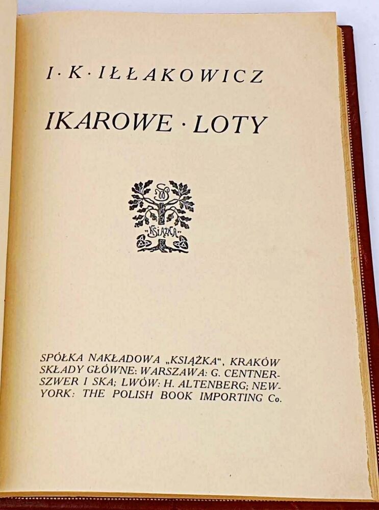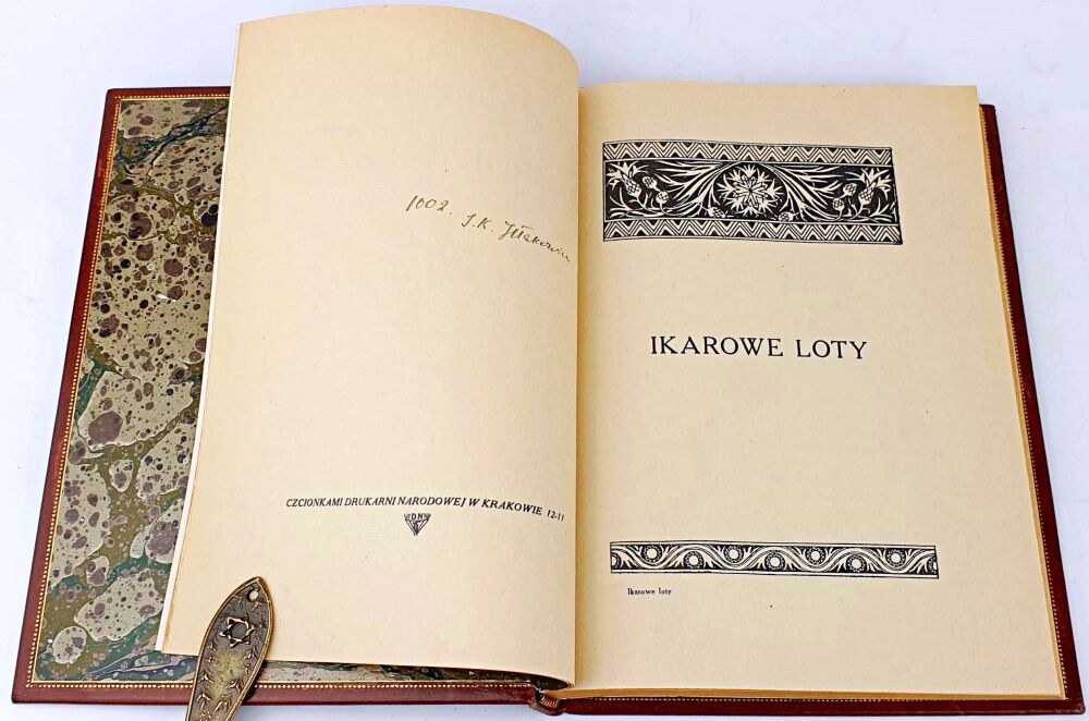Debiut poetycki autorki! Podpis na marce ochronnej oznaczonej numerem 1002. Na stronie tytułowej logo Spółki Nakładowej „Książka” projektu Stanisława Wyspiańskiego.