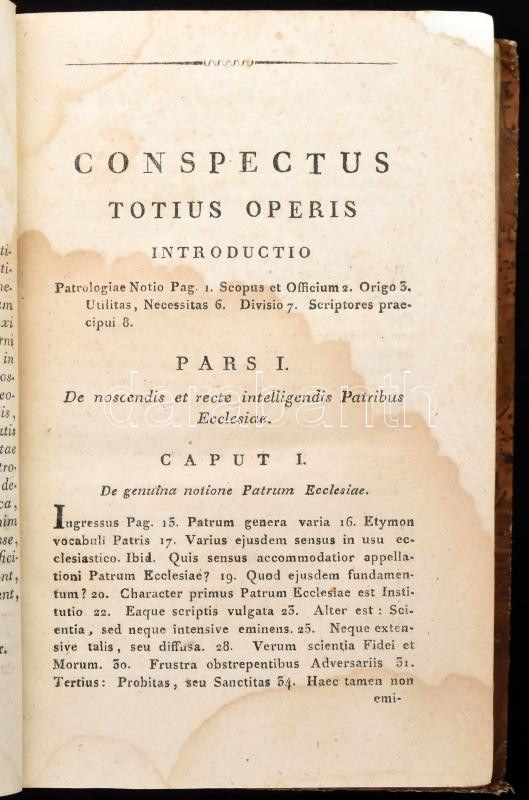 Joannes Baptista Láng: Patrologia, qua in Regia Scientiarum Universitate Hungarica Pestiensi. Praelegit - - -. Budae, 1809, Typis Unviersitatis Regiae Pestinensis, XVI+395 p. Latin nyelven. Kiadói kartonált papírkötés, kopott borítóval, foltos lapokkal, néhány restaurált lappal.