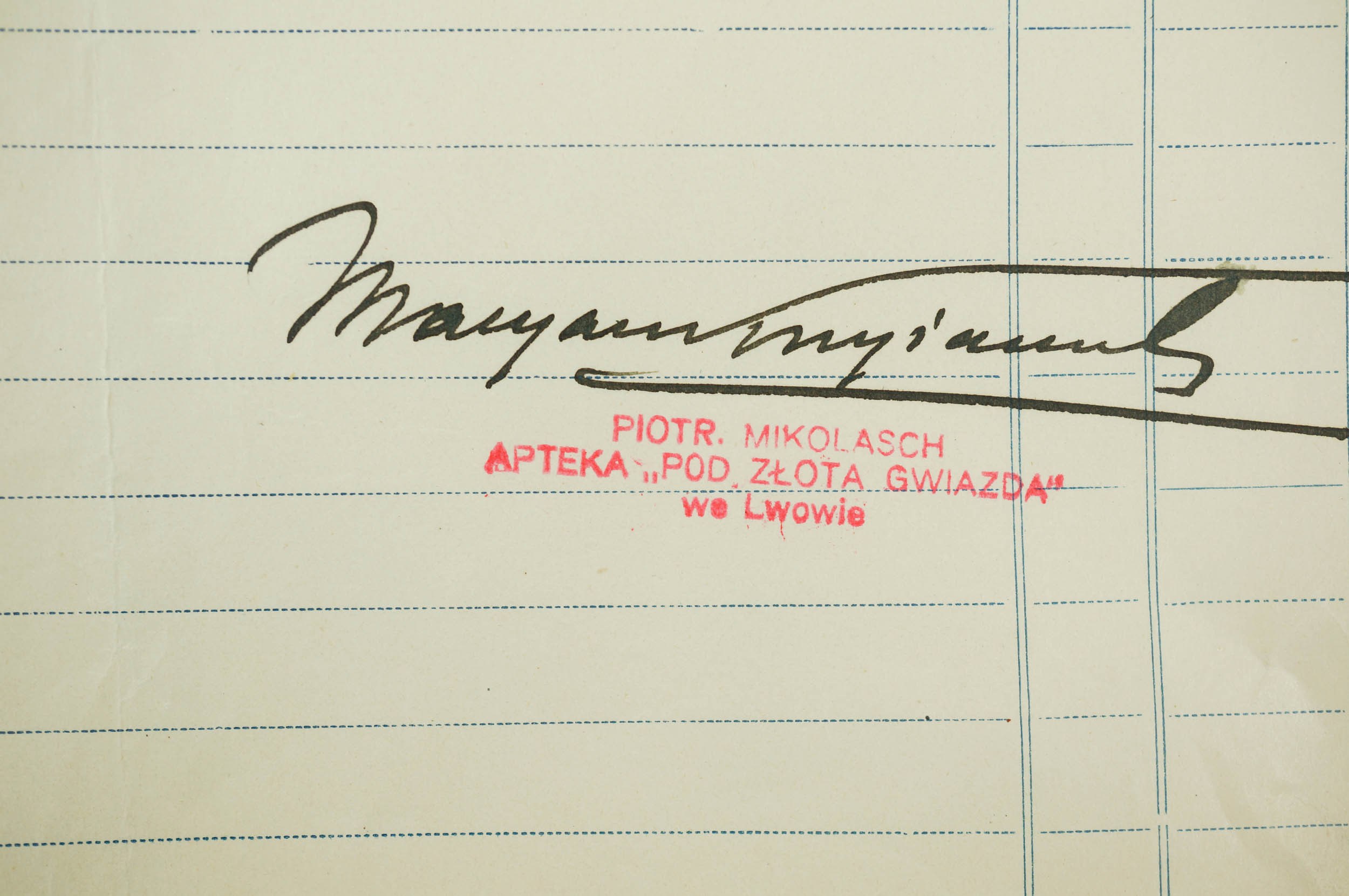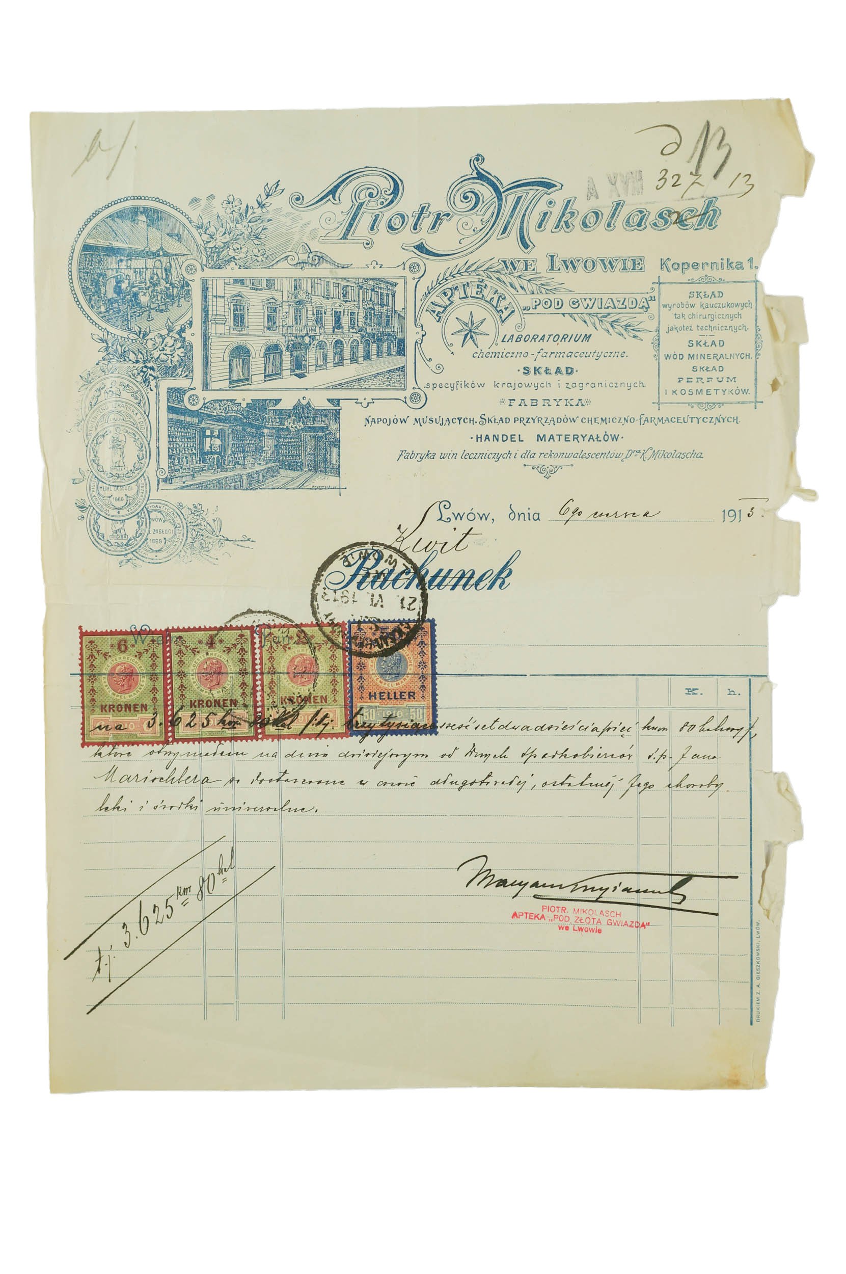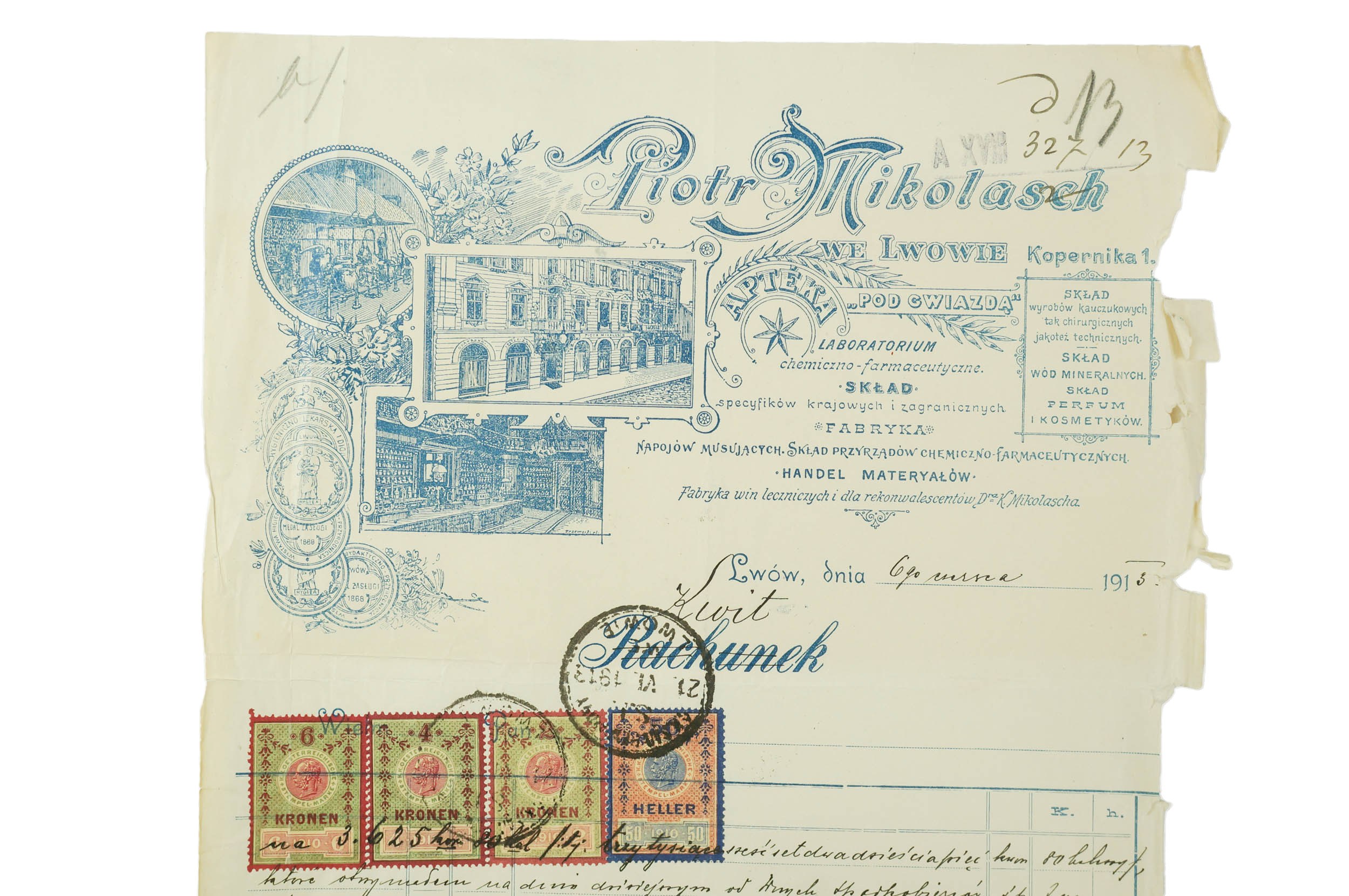 Apteka pod gwiazdą Piotr MIKOLASCH we Lwowie, Kopernika 1, RACHUNEK "na 3625 koron 80 halerzy , które otrzymałem na dzień dzisiejszy od W-mych spadkobierców .ś.p. Jana (...) za dostarczane w czasie długotrwałej ostatniej jego choroby leki i środki (...)", rachunek z pięknym nagłówkiem na którym widać kamienicę apteczną we Lwowie oraz wnętrze apteki i fabryki win leczniczych dla rekonwalescentów Dra K. Mikolascha, datowany 6 marca 1913r., f. 22,5 x 29,5cm, język polski