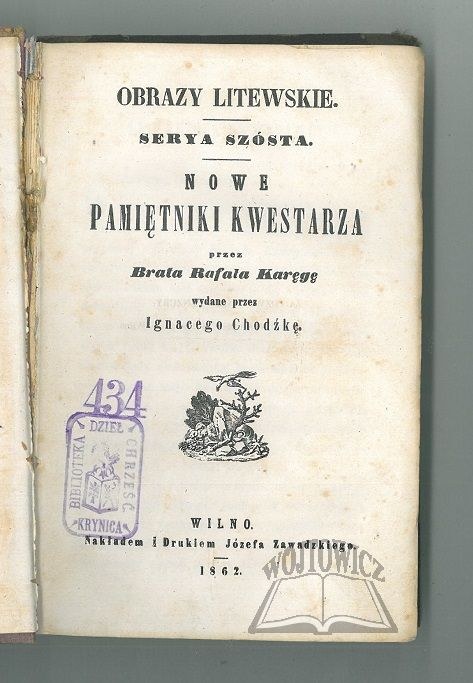 przez Brata ... wydane przez Ignacego Chodźkę. Wilno 1862. Nakł. i Druk. J. Zawadzkiego. 8, s. 346, [2], opr. ppł. z epoki. Obrazy litewskie. Serya szósta.