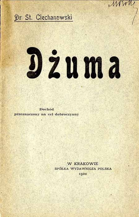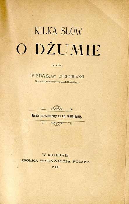 Uwagi: Na przedniej okładce: Dochód przeznaczony na cel dobroczynny. Odbitka z: "Czas" Nr 17, 18 i 19 z dnia 23, 24 stycznia 1900r. (błędnie pominięto to w opisie egzemplarza w katalogu elektronicznym Biblioteki Narodowej w Warszawie). Rzadkie