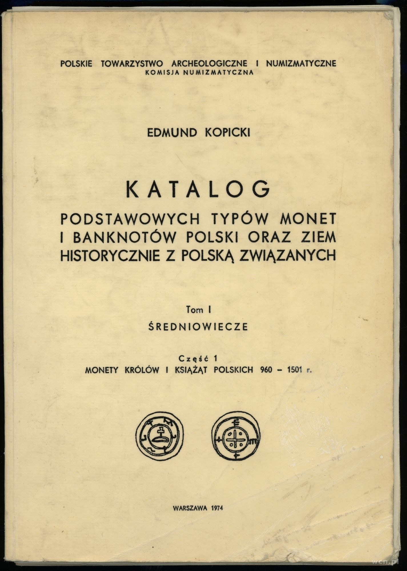 Kopicki Edmund – Katalog podstawowych typów monet i banknotów Polski oraz ziem historycznie z Polską związanych - tom I Średniowiecze, cz. 1 monety królów i książąt polskich 960-1501 r.; Warszawa 1974, brak ISBN