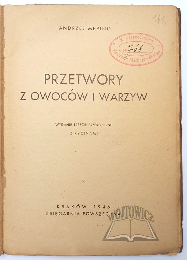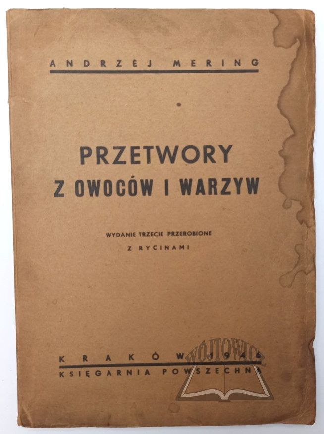 Ślady zalania, zagnieceń i niew. otarcia krawędzi okł., pieczęć własn., egz. nieprzycięty, poza tym stan wewn. dobry. Zawiera m.in.: Rola produktów ogrodn. w ożywianiu się człowieka; Wina owocowe; Owowce i warzywa w butelkach i słoikach; Kiszonki i marynaty; Susze z owoców i warzyw.