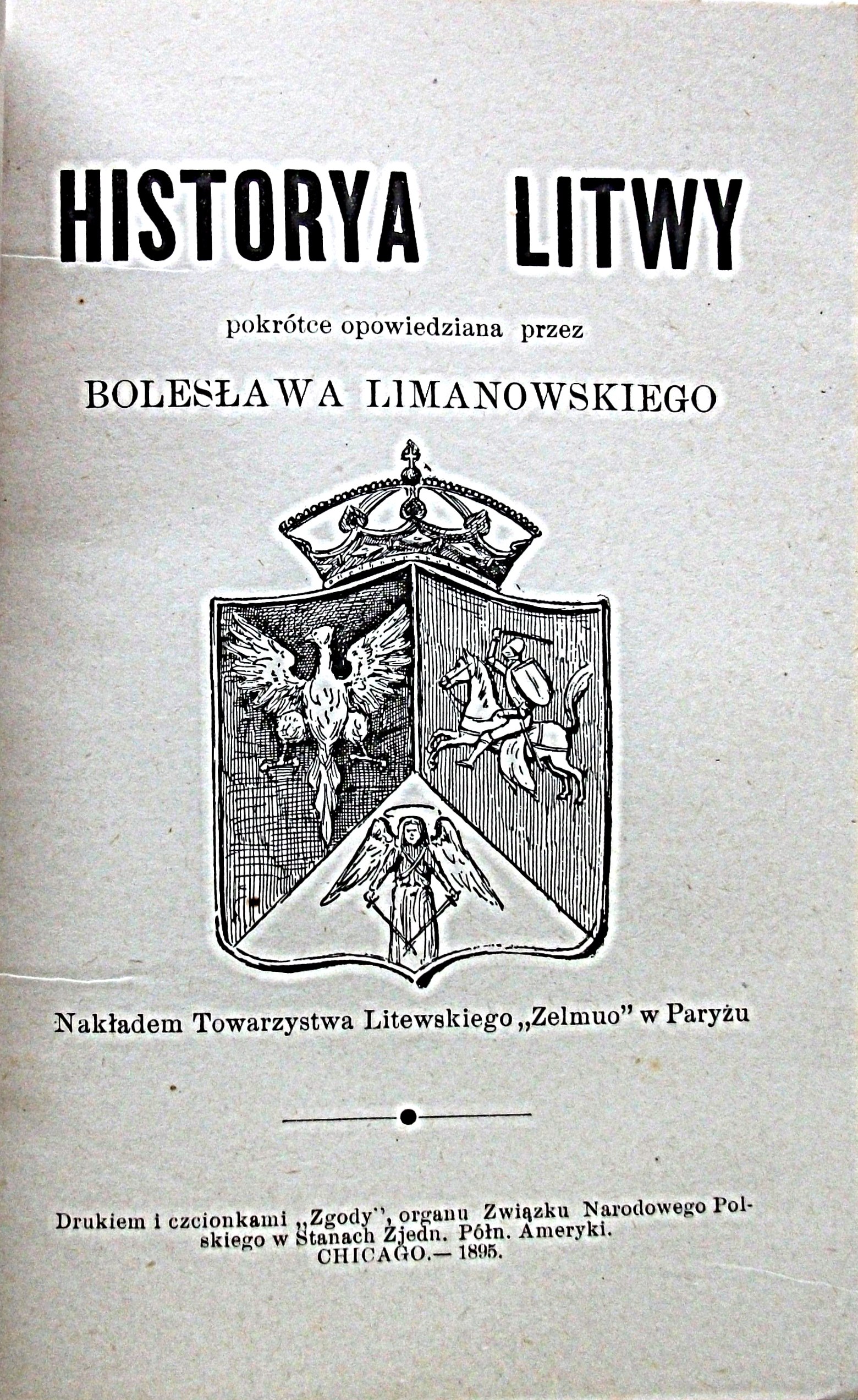 LIMANOWSKI BOLESŁAW. Historya Litwy pokrótce opowiedziana przez [...]. Chicago 1895. Nakładem Towarzystwa Litewskiego “Zelmuo” w Paryżu. Druk. “Zgody”, organu Związku Narodowego Polskiego w Stanach Zjednoczonych Am. Półn. Format 10/15 cm. s. [1], 61. Opr., brosz., wyd. (+).