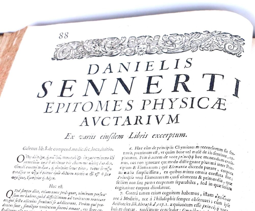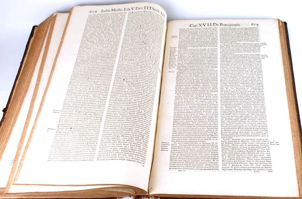 Oferowane dzieło zawiera w t.1 księgę konsensusu i niezgody chemików z Arystotelesami i Galenistami, najnowsze wydanie uosobienia nauk przyrodniczych; w t.2: Instytucje medyczne - księga piąta, O gorączce - księga czwarta; Garść leków na zarazę.