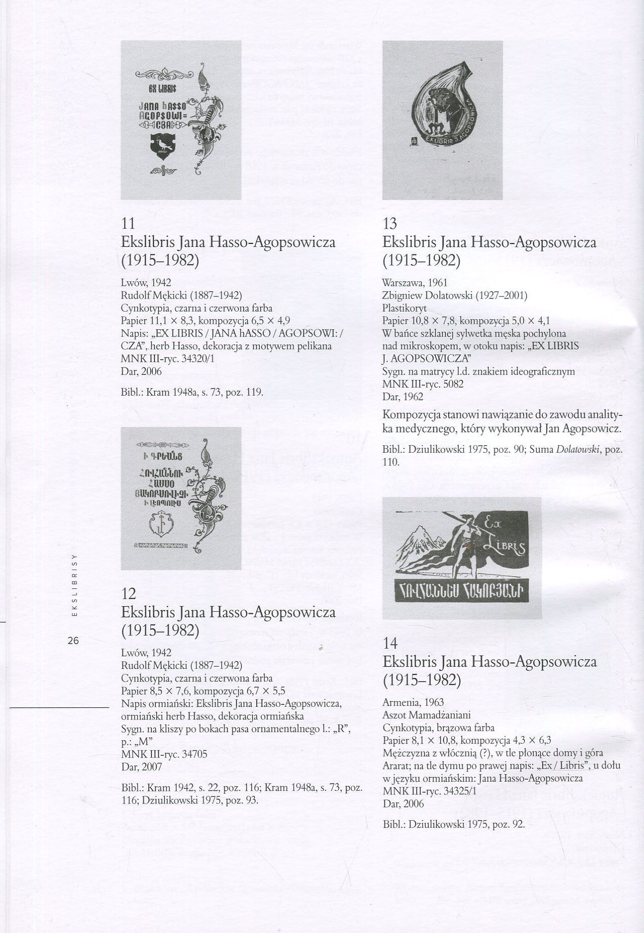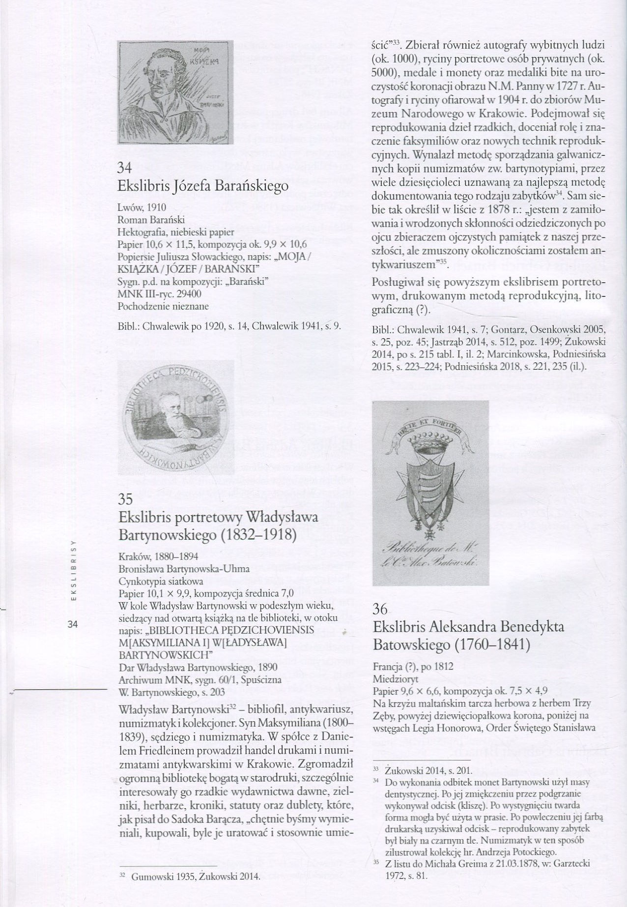Katalog przedstawia zbiór ekslibrisów przechowywany w Gabinecie Grafiki i Rysunku Muzeum Narodowego w Krakowie. We wstępie znajdują się informacje dotyczące kolekcji i historii jej pozyskiwania. W części katalogowej zaprezentowano 1367 ekslibrisów, głównie z XIX i początku XX wieku (liczne z okresu Młodej Polski), ale pojawiają się też okazy z XVI–XVIII wieku oraz czasów międzywojennych i 2. połowy XX stulecia. Ilustracjom towarzyszą opisy, krótkie glosy i bibliografie.