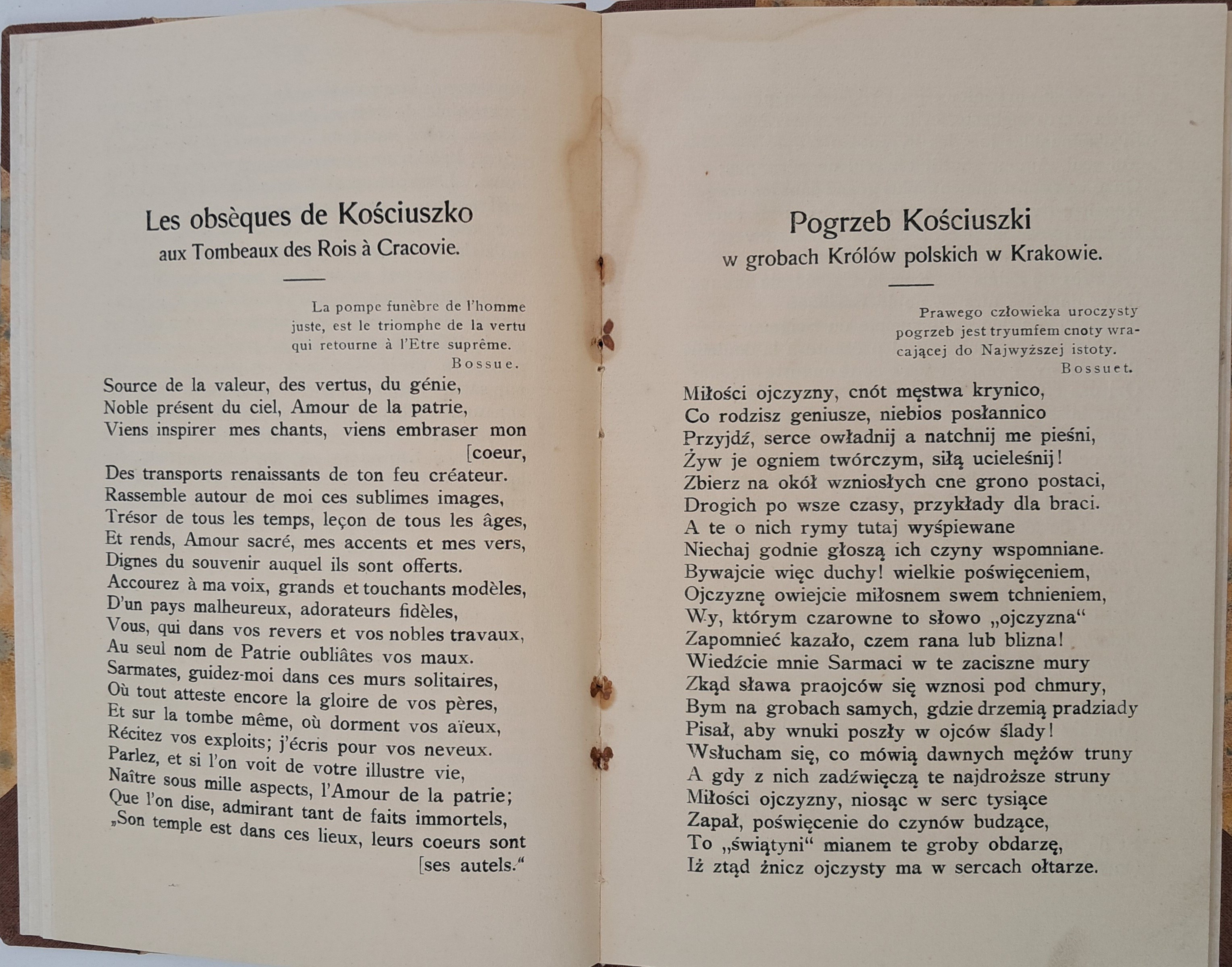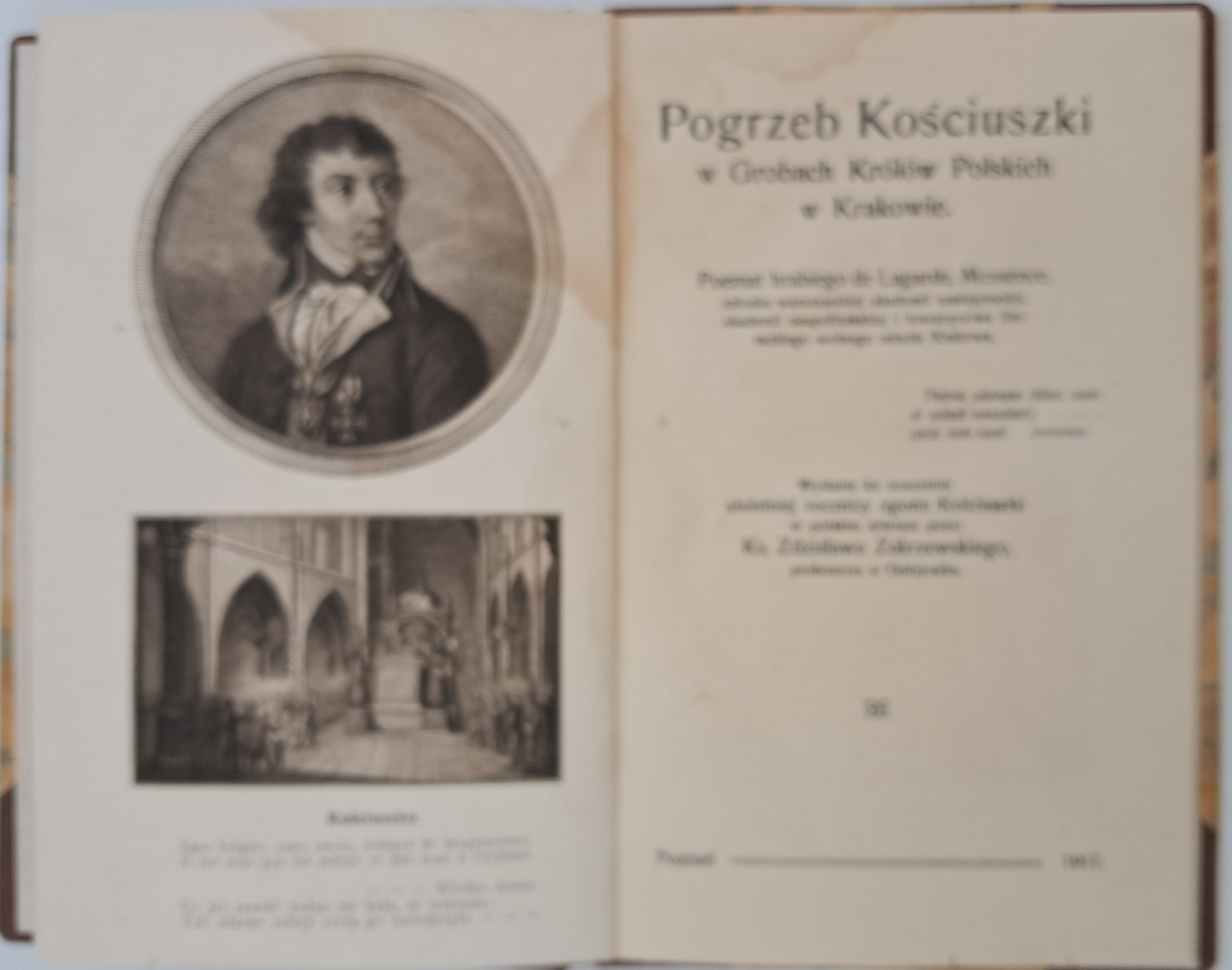 Pogrzeb Kościuszki w Grobach Królów Polskich w Krakowie. Poemat hrabiego de Lagarde, Messence członka warszawskiej akademii umiejętności, ..., Wyd. przez Ks. Zdzisława Zakrzewskiego proboszcza w Golejewku, Poznań 1917, cm 19, s. [4], 32, I plansza, oprawa artystyczna półpłótno, J.J. Jakubiak, Warszawa, Poznańska 14 (po konserwacji)