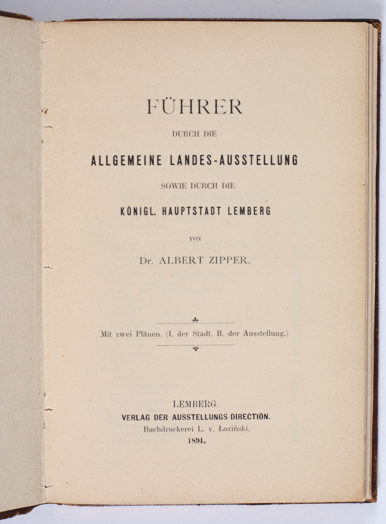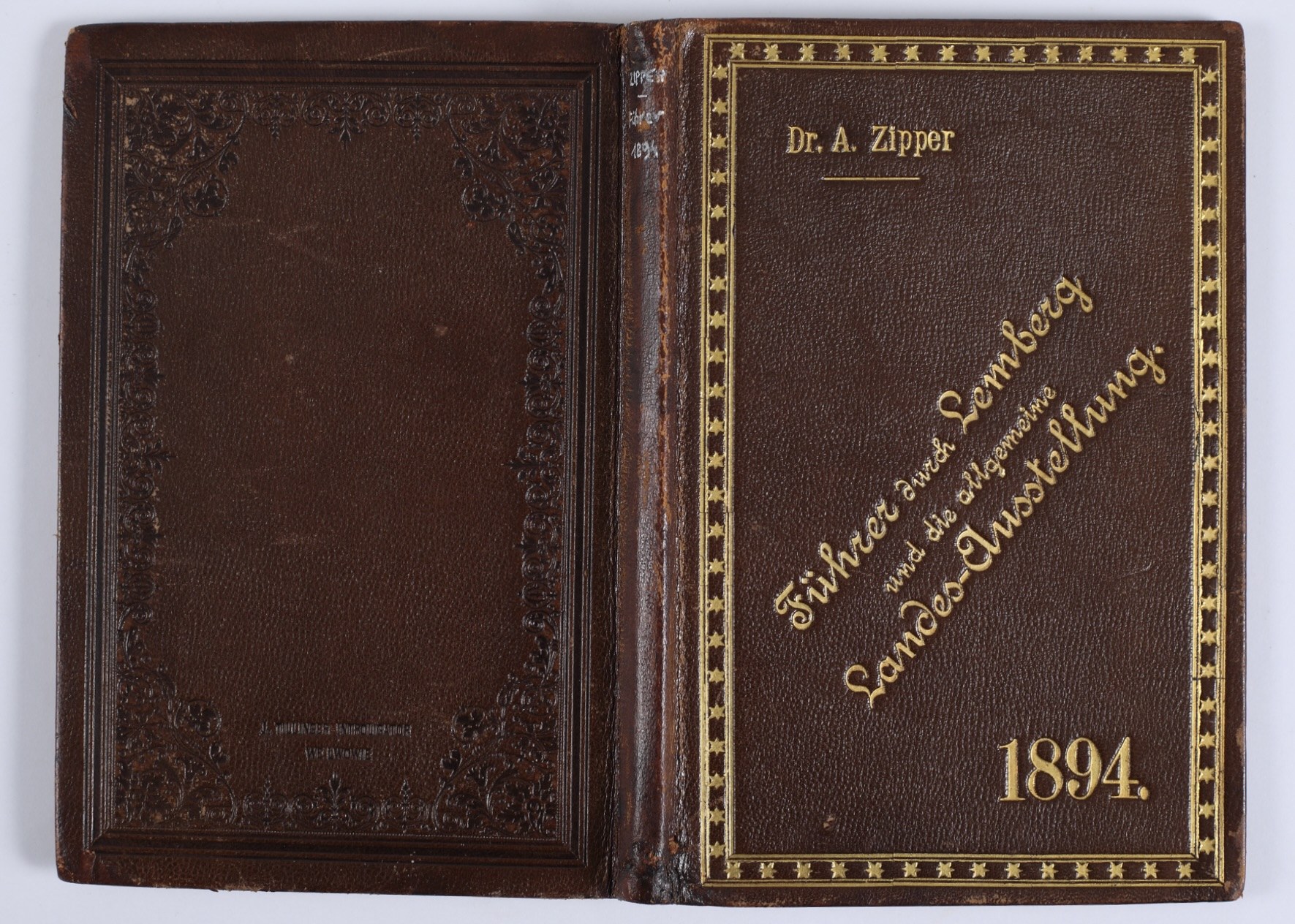 [Powszechna Wystawa Krajowa 1894] ZIPPER Albert - Fuhrer durch die Allgemeine Landes-Austellung sowie durch die Konigl. Haupstadt Lemberg von... Mit zwei Planen (I op. der Stadt. II. der Ausstelung). Lemberg (Lwów) 1894. Verlag der Ausstellungs Direction, s. [2], V, [1], 123, plany 2 (rozkł.). Wys. 18,5 cm. Oprawa ozdobna skóra z epoki z tłoczeniami i złoceniami na licu. Oprawa sygnowana na tylnym cz. okładki: J. Tillinger Intologator we Lwowie. Brzegi kart złocone. Ekslibris.