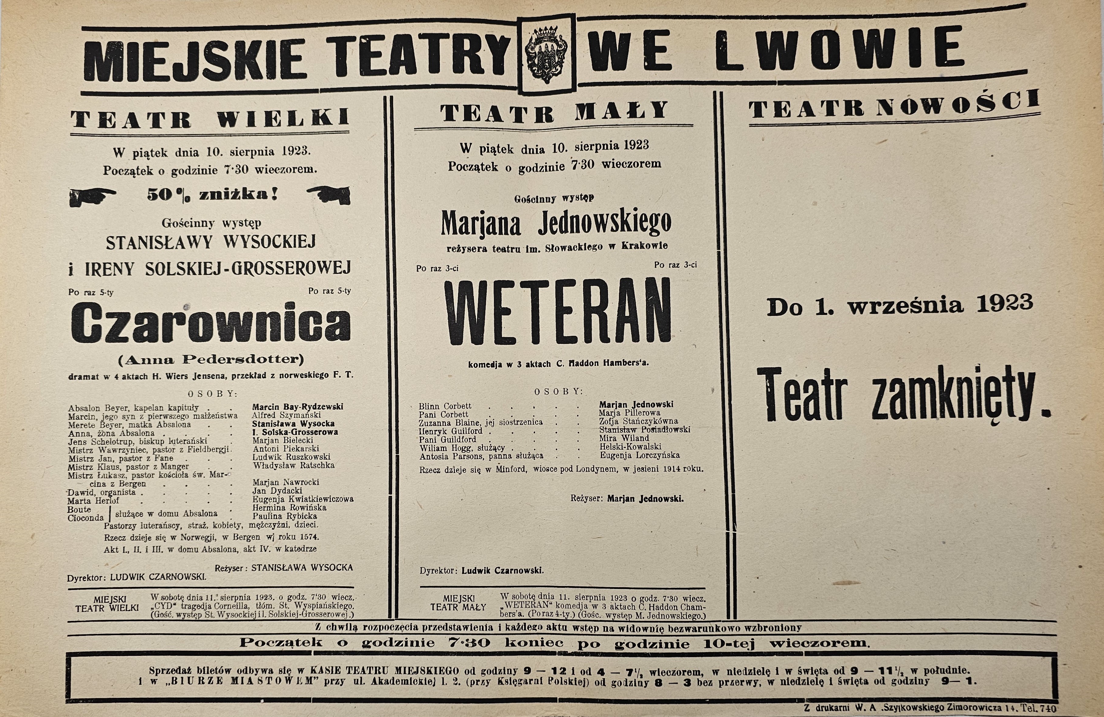 przekład z norweskiego F.T. W piątek dnia 10. sierpnia 1923 [oraz] Teatr Mały - Gościnny występ Marjana Jednowskiego reżysera teatru im. Słowackiego w Krakowie - Weteran, komedja w 3 aktach C. Maddon Hambers`a. W piątek dnia 10 sierpnia 1923. Teatr Nowości ... zamknięty. Z druk. W. A. Szyjkowskiego. Afisz o wym.: 47 x 31.5 cm. Stan dobry.