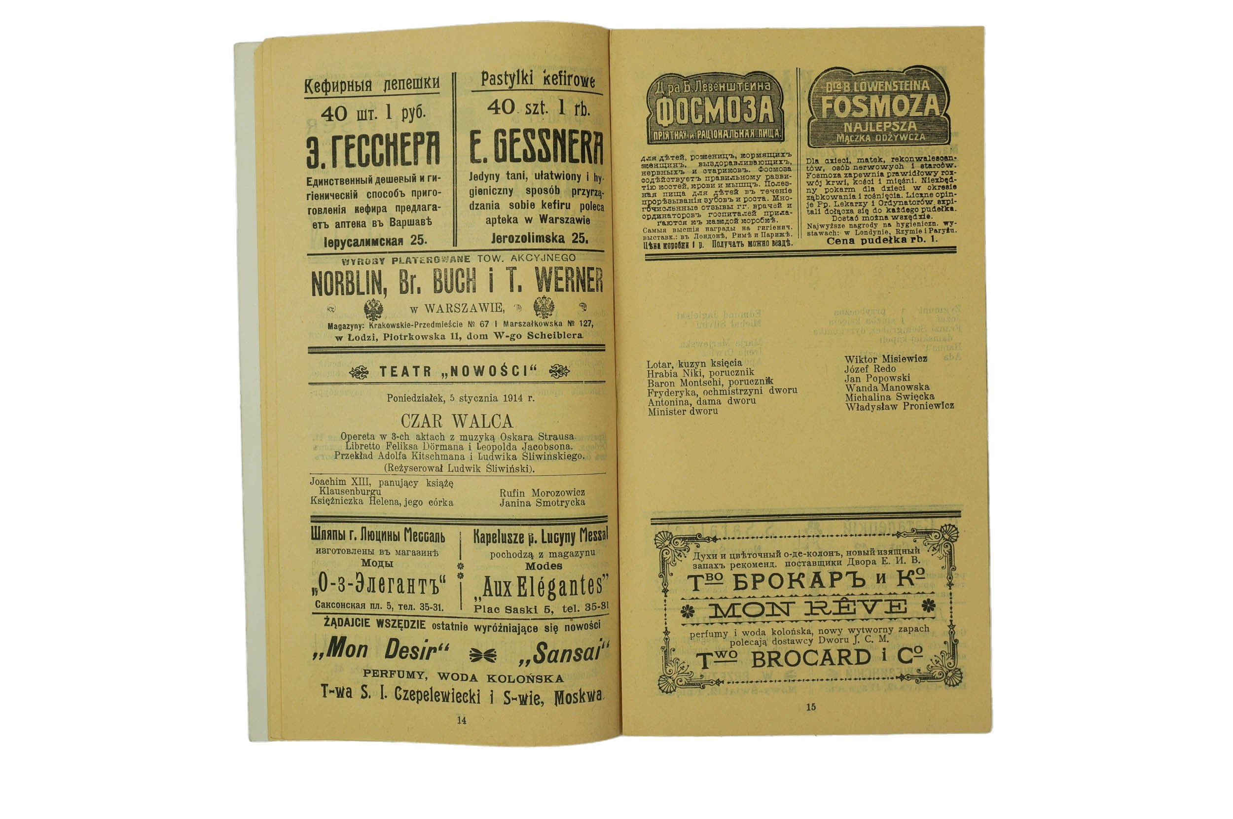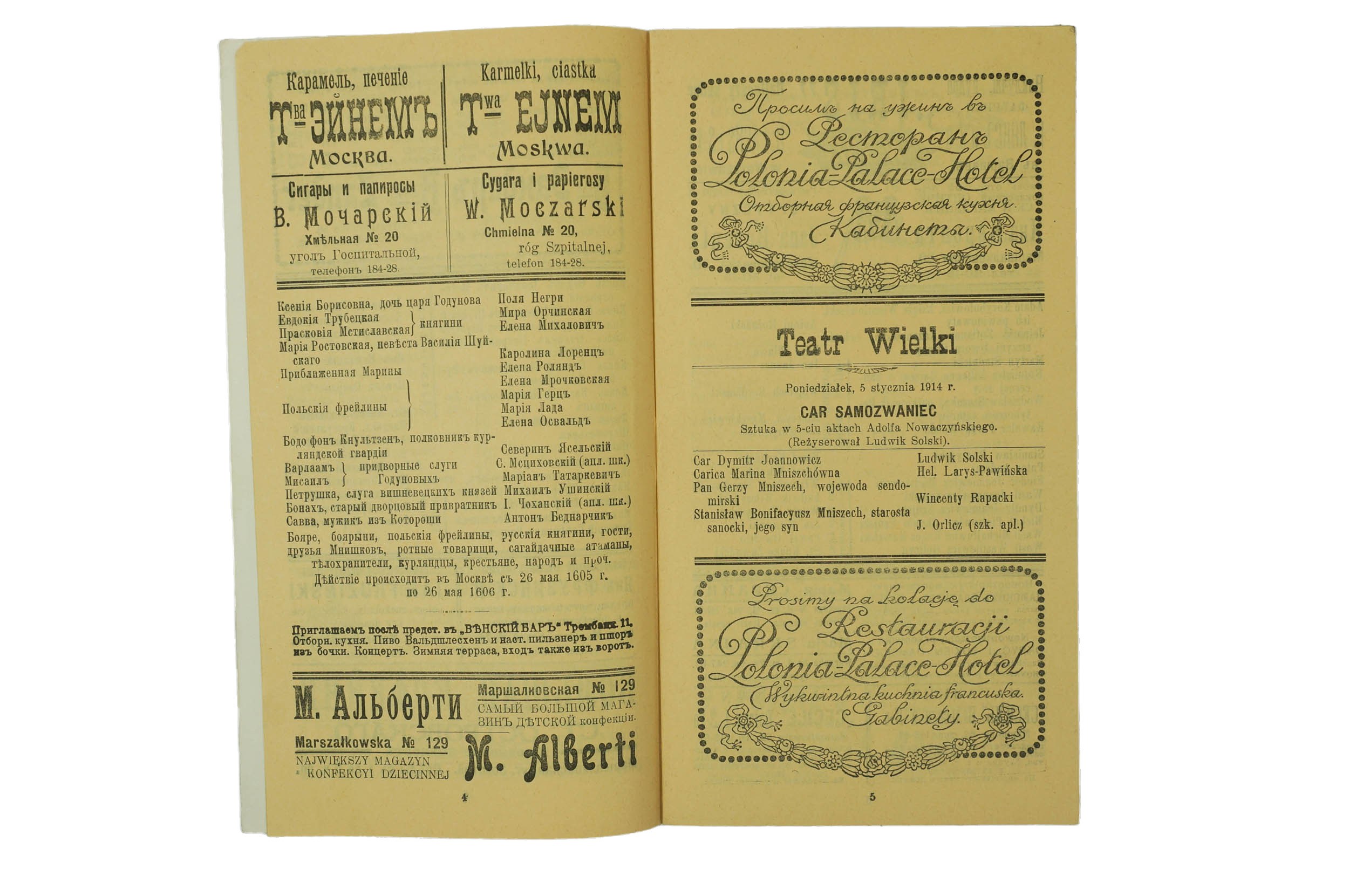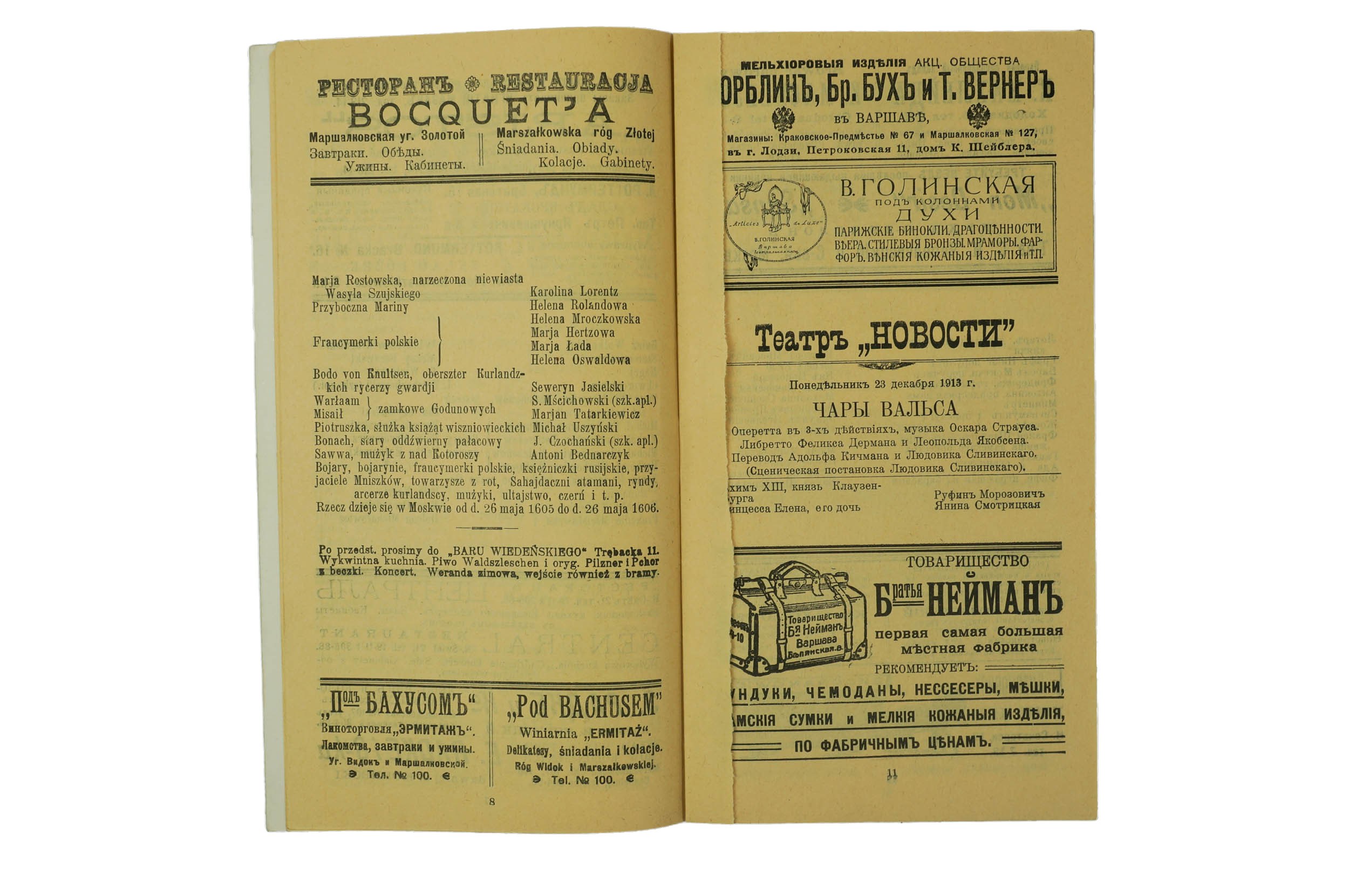 Program Warszawskich teatrów rządowych [Teatr Wielki, Teatr "Nowości", Teatr Rozmaitości, Teatr w Ogrodzie Saskim] na grudzień 1913 i styczeń 1914 roku: "Car Samozwaniec", "Czar walca", "Człowiek z budki suflera", "Hiszpańska mucha". Mnóstwo reklam renomowanych warszawskich lokali i firm. W tekście informacje o obsadzie przedstawień, zarówno tekst jak i reklamy w dwóch językach [rosyjski i polski], f. 12x22,5cm, s. 32, RZADKIE