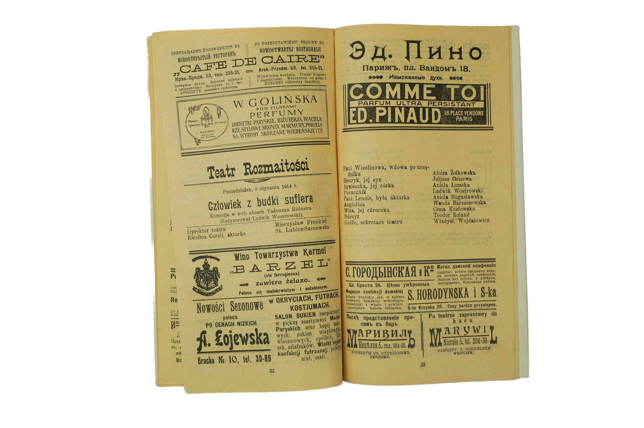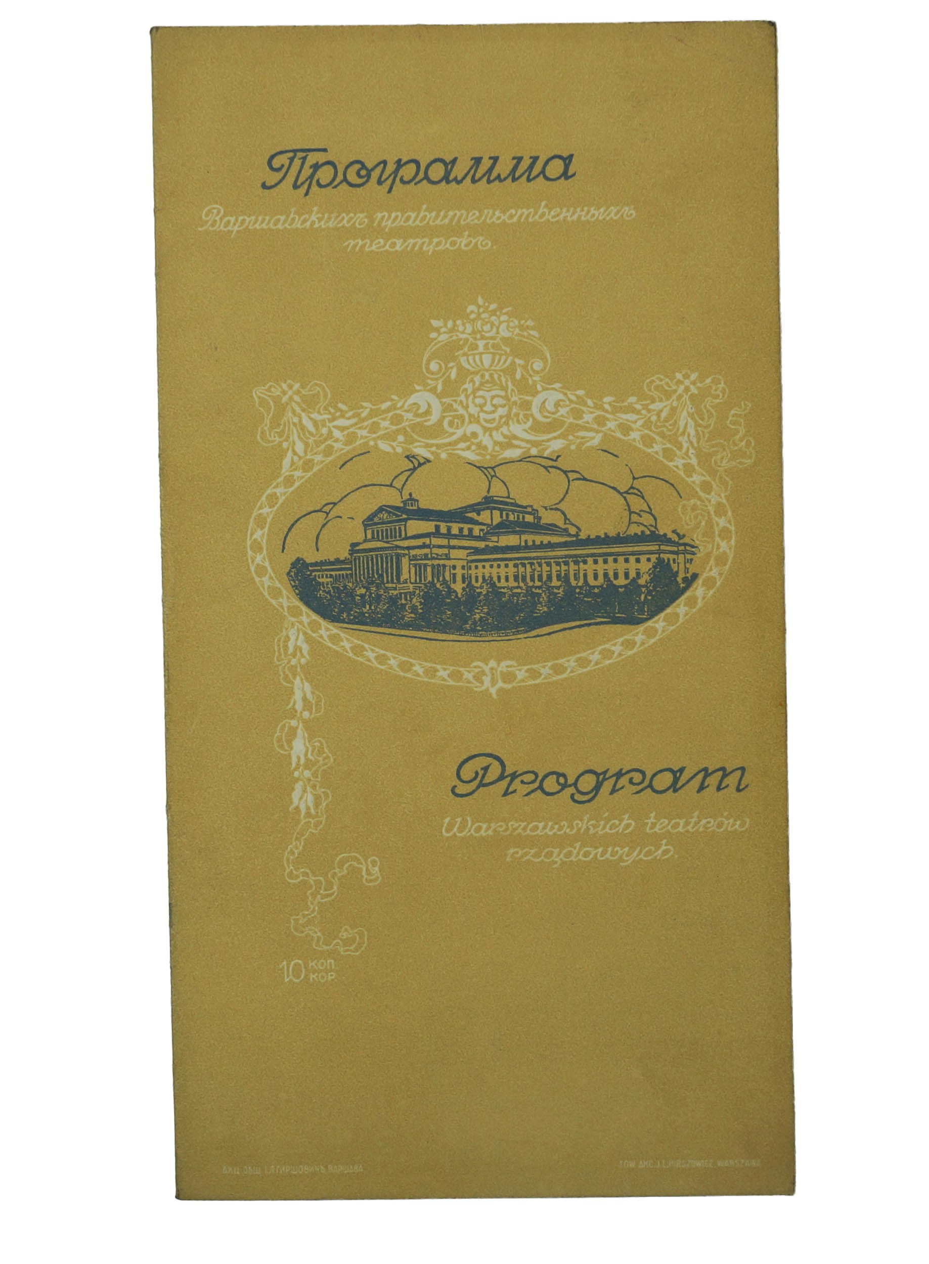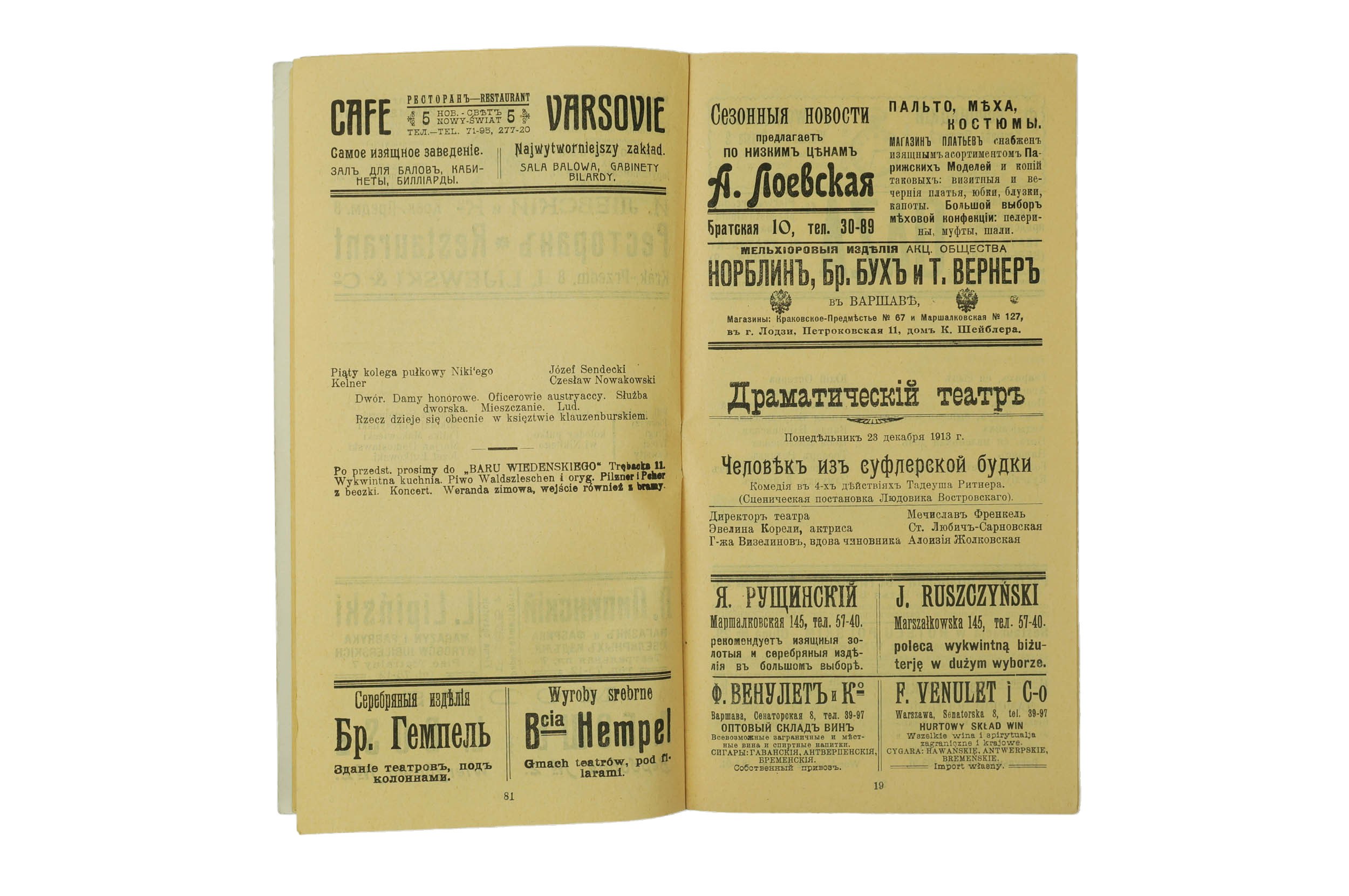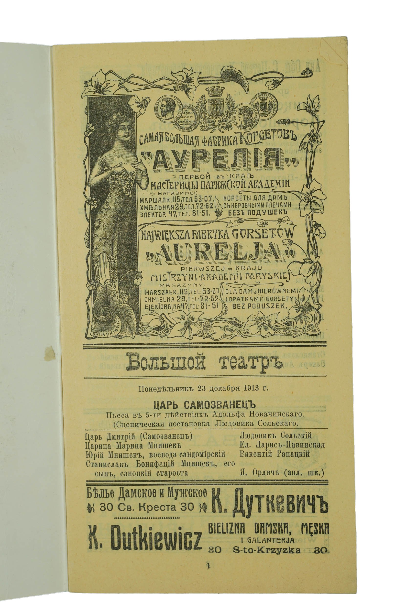 Program Warszawskich teatrów rządowych [Teatr Wielki, Teatr "Nowości", Teatr Rozmaitości, Teatr w Ogrodzie Saskim] na grudzień 1913 i styczeń 1914 roku: "Car Samozwaniec", "Czar walca", "Człowiek z budki suflera", "Hiszpańska mucha". Mnóstwo reklam renomowanych warszawskich lokali i firm. W tekście informacje o obsadzie przedstawień, zarówno tekst jak i reklamy w dwóch językach [rosyjski i polski], f. 12x22,5cm, s. 32, RZADKIE
