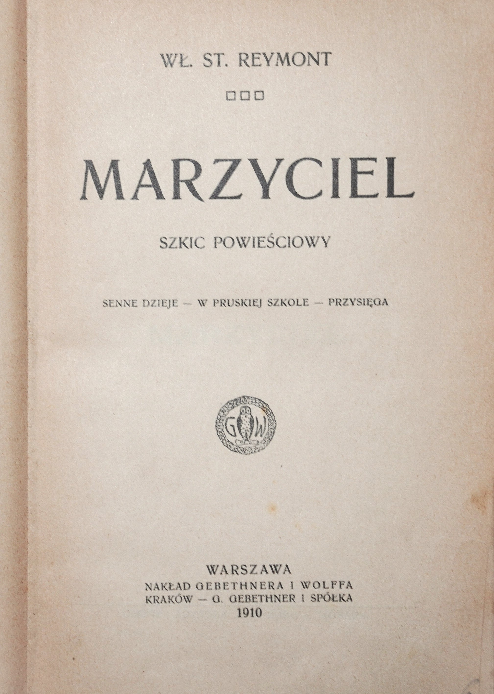 REYMONT Władysław Stanisław, Marzyciel. Szkic powieściowy. Senne dzieje-W pruskiej szkole-Przysięga, Warszawa 1910, Gebethner i Wolff, s. 332, wym. 12 x 18 cm, wydanie I, , okładka twarda, niewielkie przetarcia, zarysowania i zagięcia okładki, drobne zabrudzenia, zagięcia wyklejki, stron przedtytułowej i tytułowej, nieznaczne przebarwienia marginesów i obcięć, wyblakły ślad marmoryzowania obcięć bocznych.