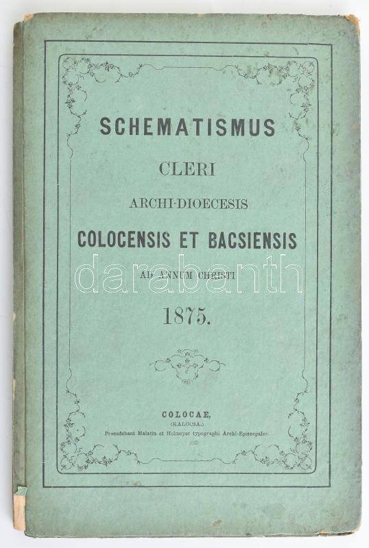 Schematismus Cleri Archi-Dioecesis Colocensis et Bacsiensis ad Annum Christi 1875. Colocae (Kalocsa), 1875, Malatin et Holmeyer, XVI+130 p. Kartonált papírkötésben, sérült, szétváló gerinccel, kissé foltos lapokkal.