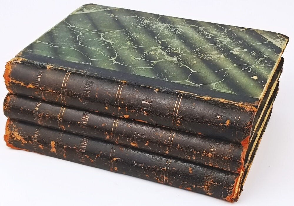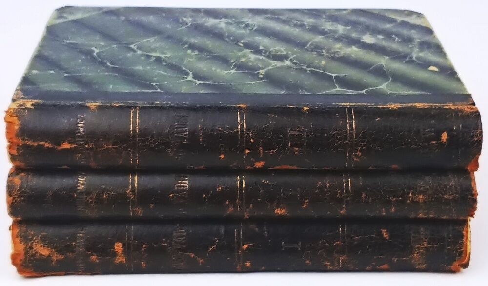 Stan DB/ otarcia opraw, przetarcia krawedzi i narożników, przekos grzbietów, sporadycznie przebarwienia, urwany górny narożnik jednej z k. bez szkody dla tekstu, pomimo drobnych wad EGZEMPLARZ GODNY UWAGI