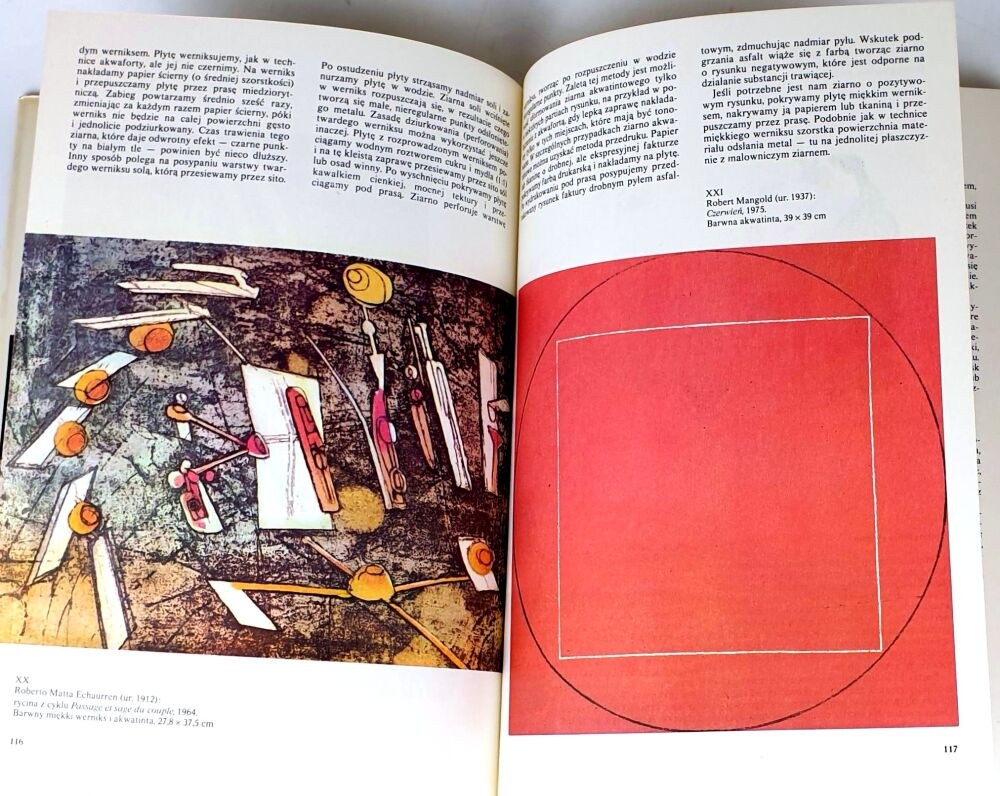 Sztychy wklęsłodrukowe Miedzioryt Rozwój miedziorytu Technika miedziorytu Przygotowanie płyty metalowej do grawerowania Przenoszenie rysunku Wykonanie rytu Staloryt Ryt punktowany Ryt puncowany Suchoryt Sposób kredkowy (mechaniczny) Mezzotinta Nacinanie płyty Rysunek mezzotintowy Kwasoryty wklęsłodrukowe Akwaforta Rozwój akwaforty Technika akwaforty Przygotowanie płyty metalowej Przygotowanie werniksu Werniks twardy Nakładanie werniksu Wykonanie szkicu i przeniesienie go na werniks Rycie rysunku w werniksie Wytrawianie rysunku Środki trawiące Różnicowanie rysunku przez trawienie Akwaforta punktowana Sposób kredkowy (maniere de crayon) Akwaforta groszkowana Miękki werniks (vernis mou) Przygotowanie płyty i warstwy werniksu Nanoszenie miękkiego werniksu Przenoszenie rysunku Rysowanie na werniksie Trawienie Poprawianie wytrawionego rysunku Akwaforta na kruchym werniksie Przygotowanie i nanoszenie werniksu na płytę Technika rysunku Trawienie Akwatinta (kwasoryt płaszczyznowy) Przygotowanie płyty akwatintowej Napylanie powierzchni płyty Zapiekanie ziarna Inne rodzaje ziarna akwatintowego Nanoszenie rysunku Akwatinta bez rysunku linearnego Akwatinta z rysunkiem linearnym Akwatinta trawiona jednorazowo Trawienie akwatinty Czasy trawienia Mezzo-akwatinta Kwasoryt kredkowy (Z wykorzystaniem światłoczulego asfaltu) Techniki odpryskowe (reservage) Odprysk atramentowy Pozytywowy odprysk temperowy Negatywowy odprysk atramentowy Negatywowy odprysk tuszowy Negatywowy odprysk kredkowy Odprysk olejowy Akwaforta lawowana Lepki werniks Lawowanie pastą trawiącą na płycie miedzianej Lawowanie na cynku Lawowanie farbą olejną Negatywowe lawowanie Kwasoryt bezpośredni Heliograwiura Pierwotna metoda pracy Łączenie różnych technik druku wklęsłego