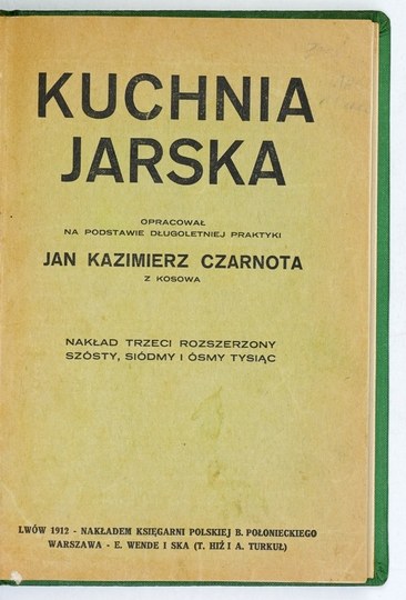CZARNOTA Jan Kazimierz - Kuchnia jarska. Opracował na podst. długoletniej praktyki ... z Kosowa. Nakł. III rozszerzony. Lwów 1912. Księg. Polska B. Połonieckiego. 16d, s. VII, [1], 231, [2]. opr. wsp. pł. z zach. okł. brosz.