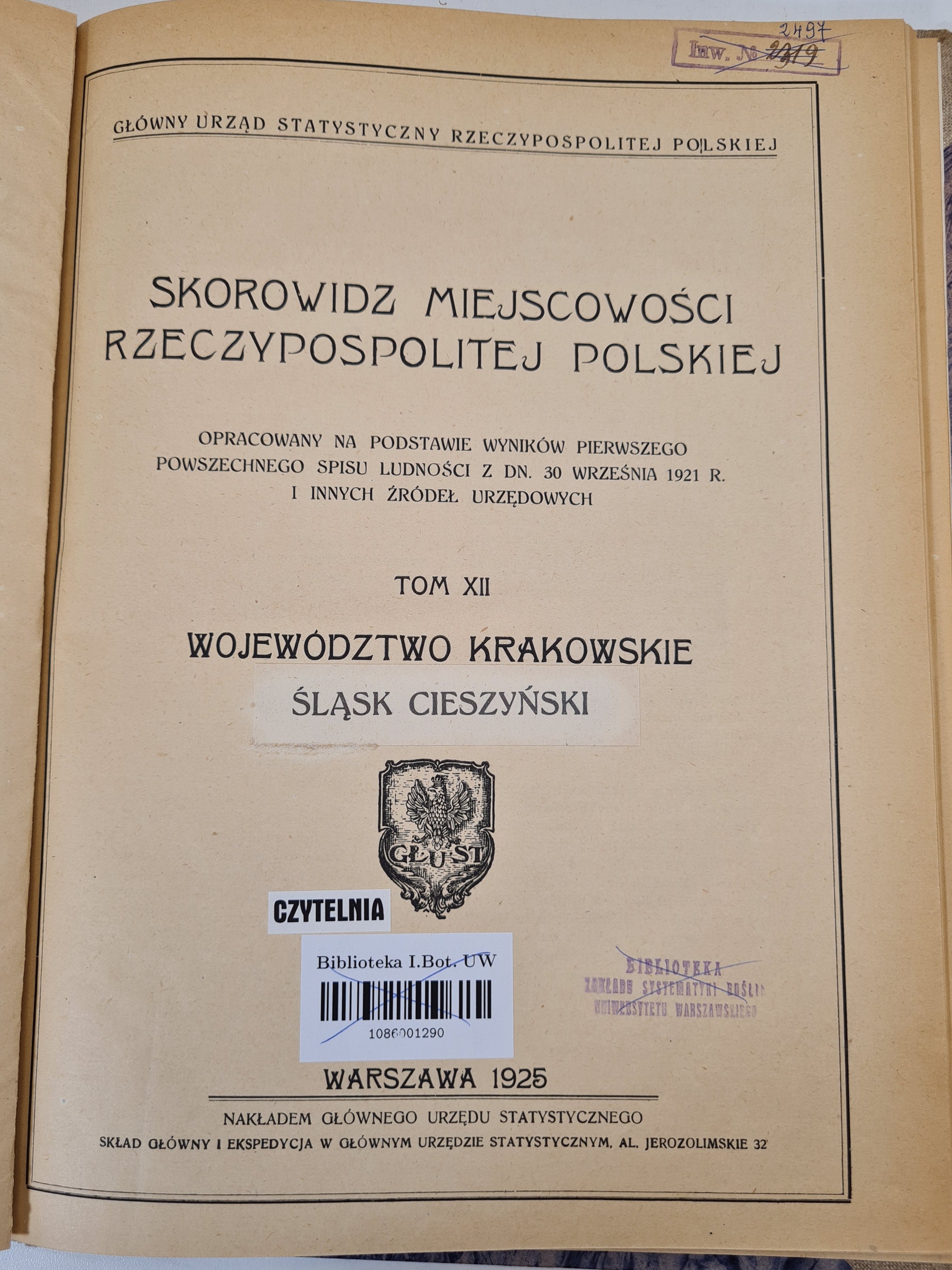 Nakładem Głównego Urzędu Statystycznego, Warszawa 1925. Wym.24,5x32 cm; stron 54 + 7. Oprawa introligatorska, twarda, półpłócienna (niewielkie zabrudzenia). Pieczątki własnościowe, nalepki. Nieznaczne ślady użytkowania. Naddarcia kart.