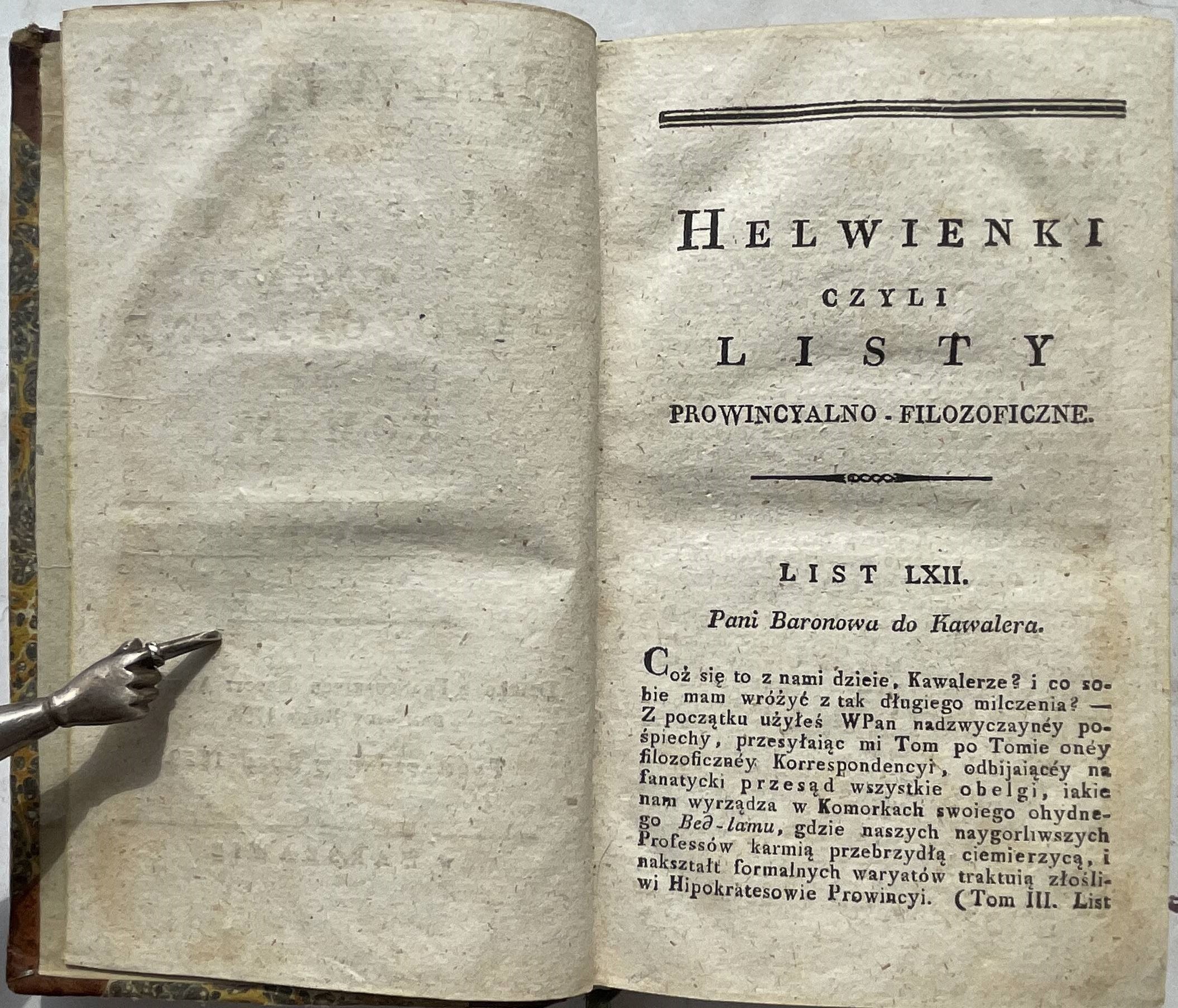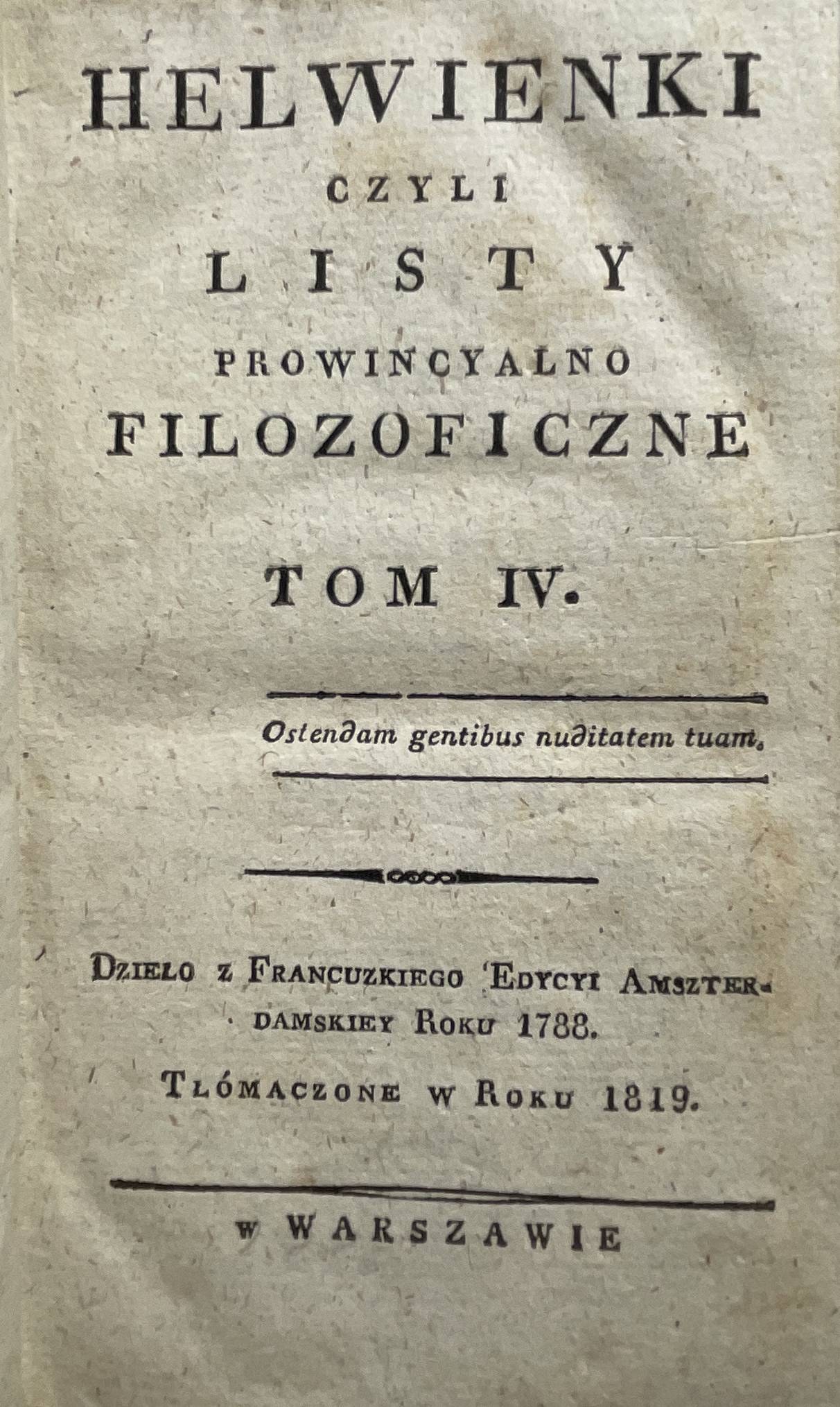 [Barruel Augustyn], Helwienki czyli listy prowincyalno filozoficzne. Tom IV. Warszawa 1819, b.w. 18 cm, str. 372. Ładna oprawa z epoki płsk. z szyldem na grzb., stan b. dobry.