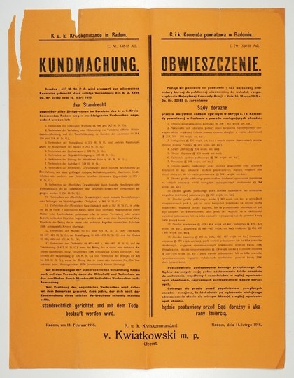 OBWIESZCZENIE. Podaje się ponownie [...] do publicznej wiadomości, że [...] zarządzono sądy doraźne przeciw wszystkim osobom cywilnym w okręgu c. i k. Komendy powiatowej w Radomiu z [powodu następujących zbrodni: 1) Zbrodni nieuprawnionego werbunku [...], 3. Szpiegostwa [...], 4. Zdrady głównej [...], 5. Obrazy Majestatu [...], 7. Powstania [...], 8. Zbrodni gwałtu publicznego przez złośliwe uszkodzenie kolei żelaznych [...]. Ostrzega się przeto przed popełnieniem powyższych zbrodni i oznajmia, że ktokolwiek [...] stanie się winnym [...] będzie postawiony przed Sąd doraźny i ukarany śmiercią. Radom, 14 II 1918. [Podp.] K. u. k. Kreiskommandant v. Kwiatkowski, Oberst. [W nagłówku]: C. i k. Komenda powiatowa w Radomiu".