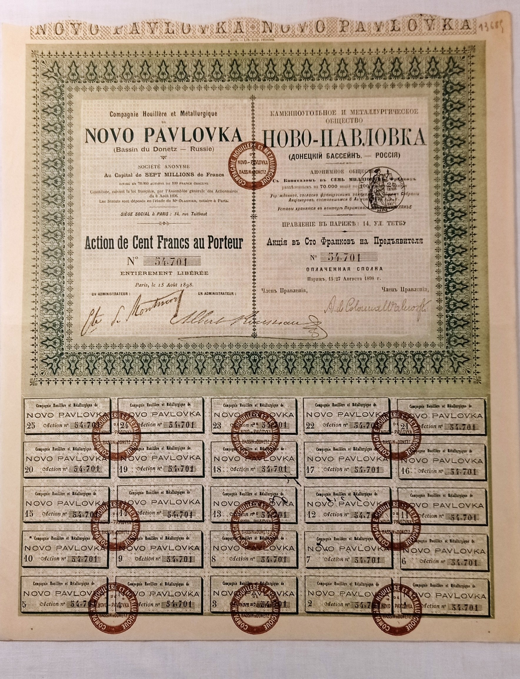 Akcja francuskiej kompanii górniczo-hutniczej inwestującej w Doniecku. Motywy dekoracyjne waloru z bordiurą o kształtach geometryczno-roślinnych. Na walorze widnieje z prawej strony podpis odręczny prawnuka Napoleona Bonaparte „A[ndré] de Collona Walewski”. André Walewski (1871–1954) francuski biznesmen, założyciel słynnej paryskiej działającej do dziś grupy taksówek „G 7” był synem Aleksandra Antoniego Walewskiego (1844–1898), a wnukiem Aleksandra Floriana Walewskiego (1810–1868), ministra spraw zagranicznych Francji, syna naturalnego Napoleona I i Marii Walewskiej. Ciekawostka nie tylko na polskim rynku antykwarycznym.