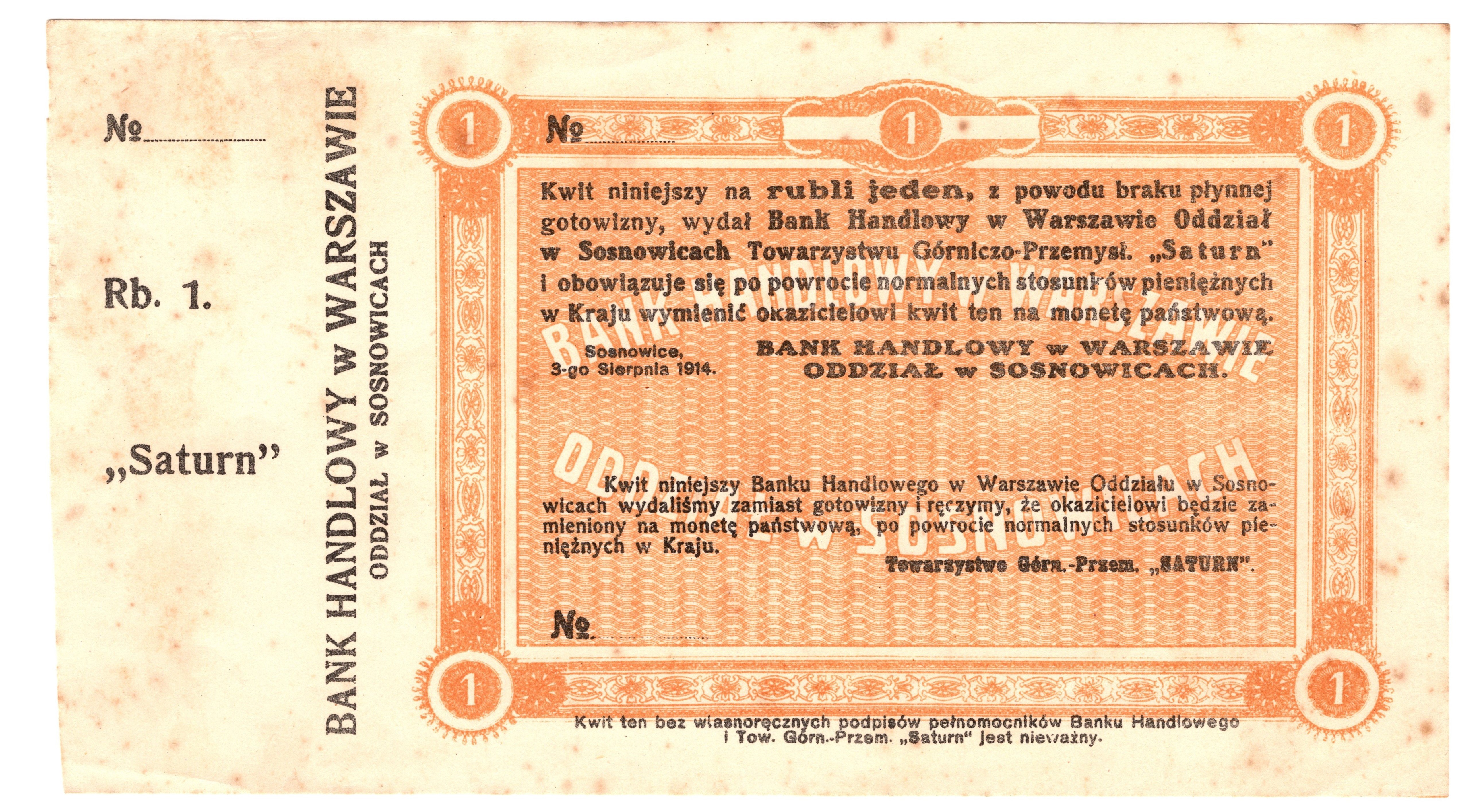 „Saturn” Sosnowice, Bank Handlowy w Warszawie, 03.08.1914 - Kwit na 1 rubel.