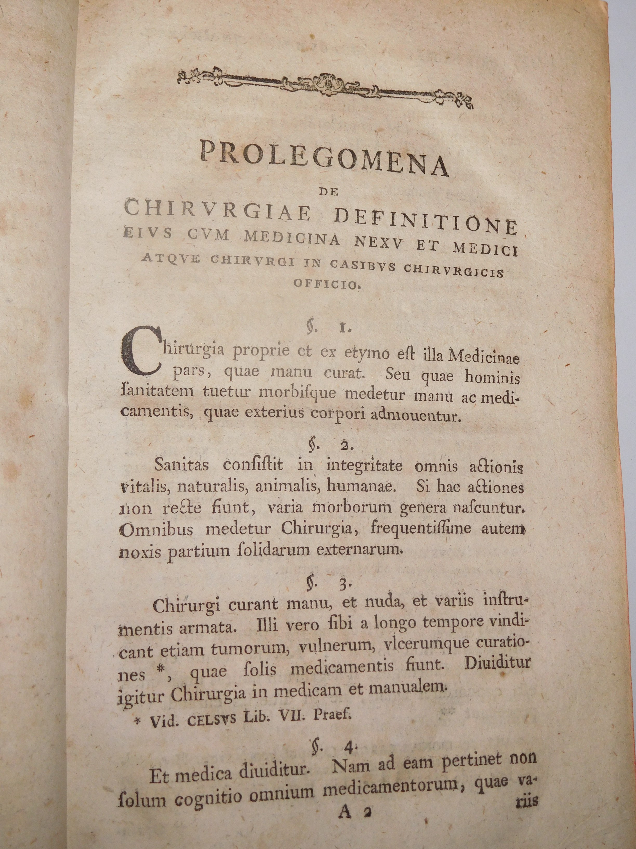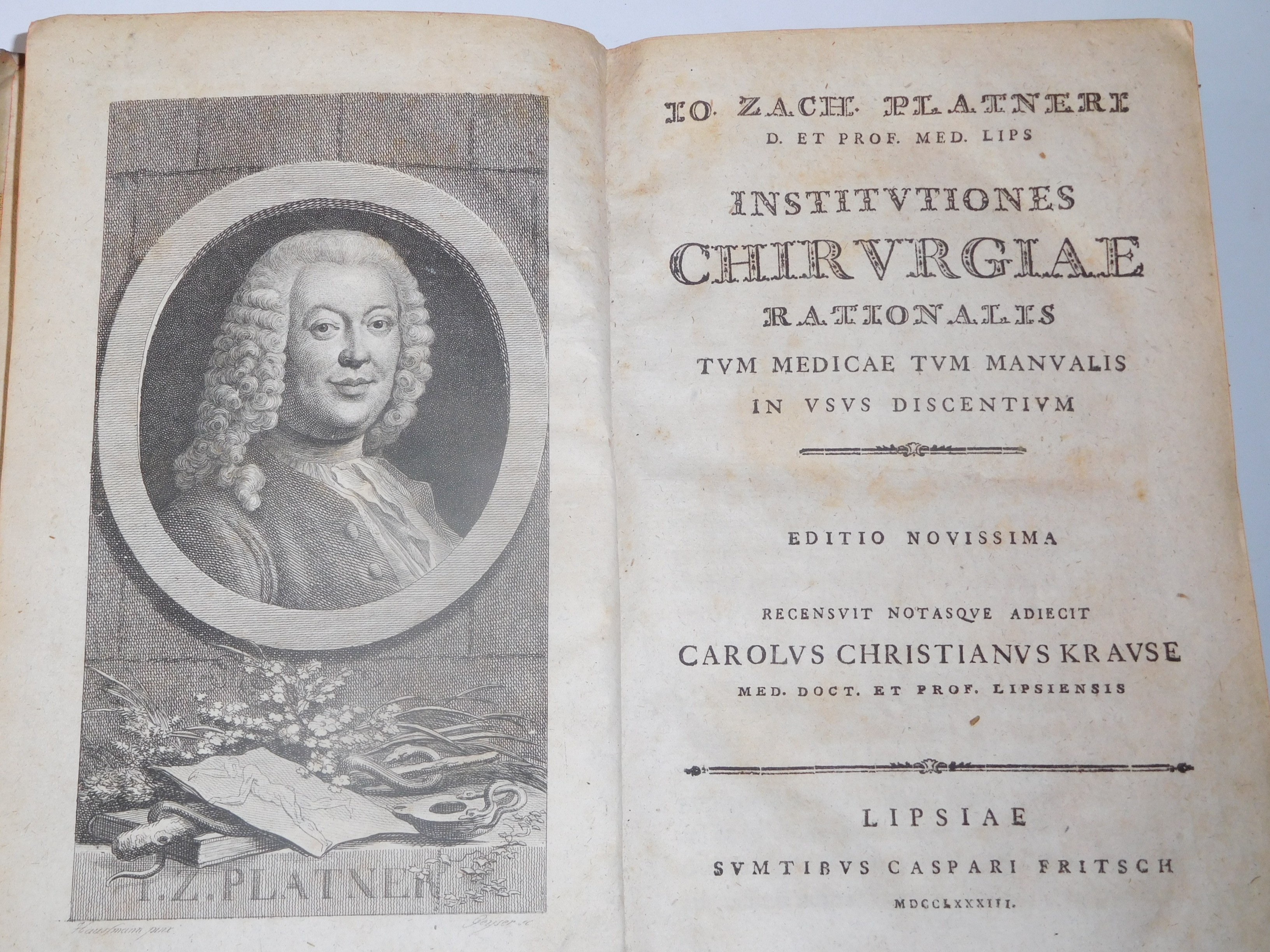Uzupełnione notami Carla Christiana Krause wydanie jednego z klasycznych traktatów medycznych dotyczących chirurgii w osiemnastowiecznej Europie. Autor Johan Zacharias Platner  (1694–1747), był lekarzem, chirurgiem, profesorem i rektorem Uniwersytetu w Lipsku.  Tom pierwszy całej serii z 2 w komplecie ilustrowany portretem Autora na frontispisie. Tekst w j. łacińskim.