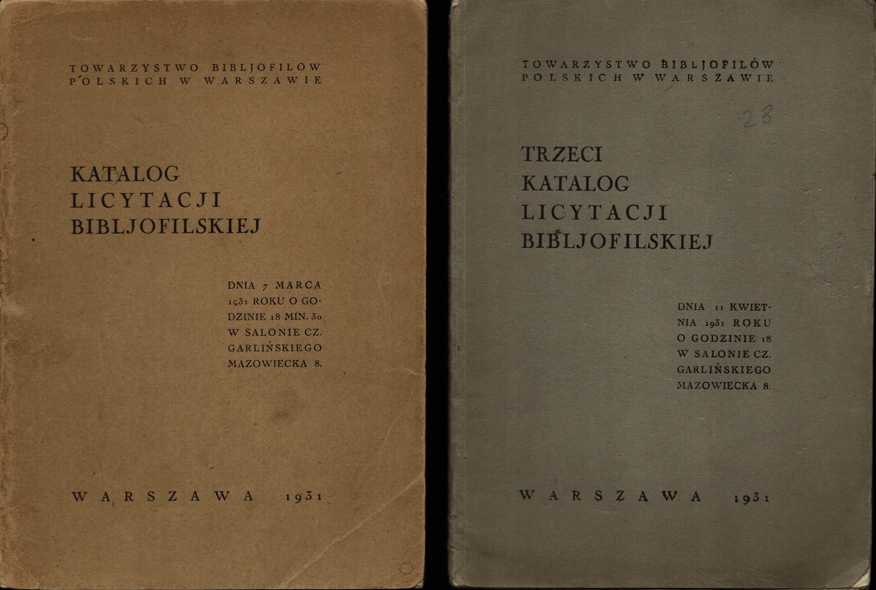 - Katalog Licytacji Bibljofilskiej. Warszawa 1931. TBP. S. 29. Wys. 17 cm. Uszkodzenia cz. kart. Ekslibris.