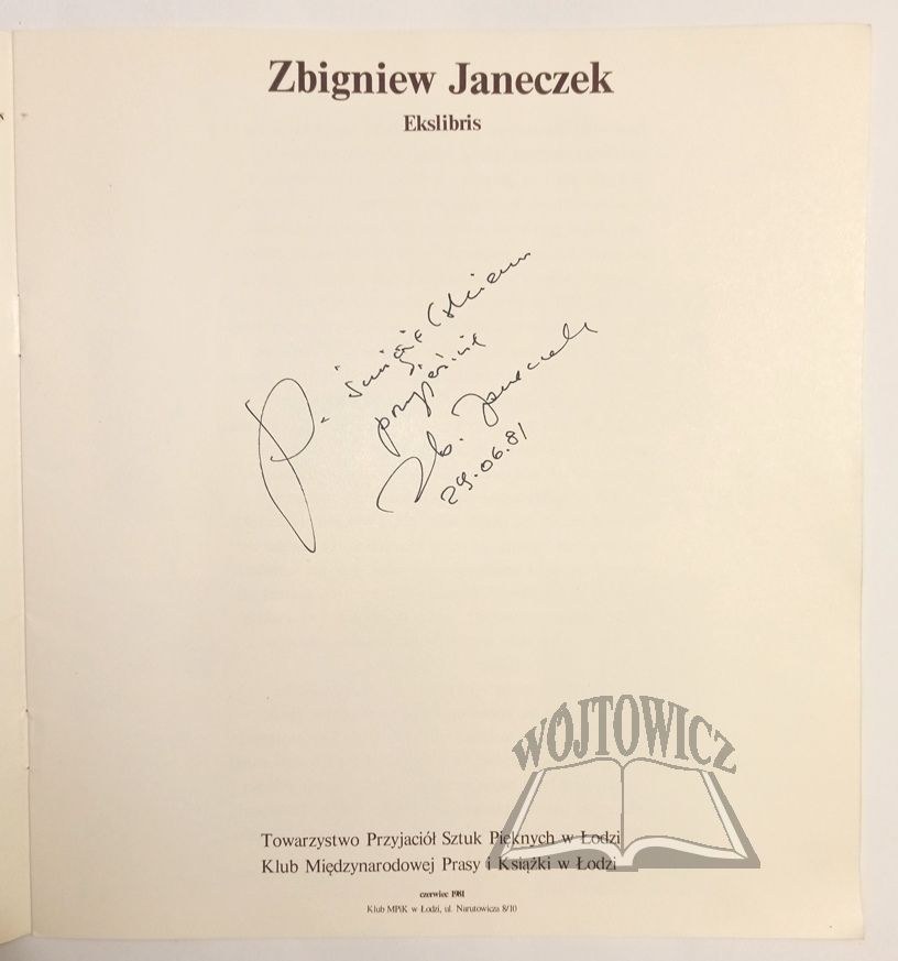 Wystawa zorganizowana z okazji 25-cio lecia Tow. Przyjaciół Sztuk Pięknych w Łodzi. Łódź 1981. Tow. Przyjaciół Sztuk Pięknych w Łodzi. Klub Międzynarodowej Prasy i Książki w Łodzi. 8, s. [4], iustr., ok. brosz. oryg. Stan dobry, niew. otarcia okł. Na karcie tyt. odręczna dedykacja Z. Janeczka dla W. Śmigielskiego. 9318/11