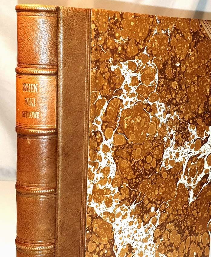 TWARDA OPRAWA PÓŁSKÓREK WSPÓŁCZESNY, GRZBIET Z WYPUKŁYMI ZWIĘZAMI, TŁOCZENIAMI I ZŁOCENIAMI, BARWNY SZYLDZIK, KARTON MARMORYZOWANY. OBCIĘCIA KART BARWIONE. ZACHOWANE OKŁADKI WYDAWNICZE MIĘKKIE.