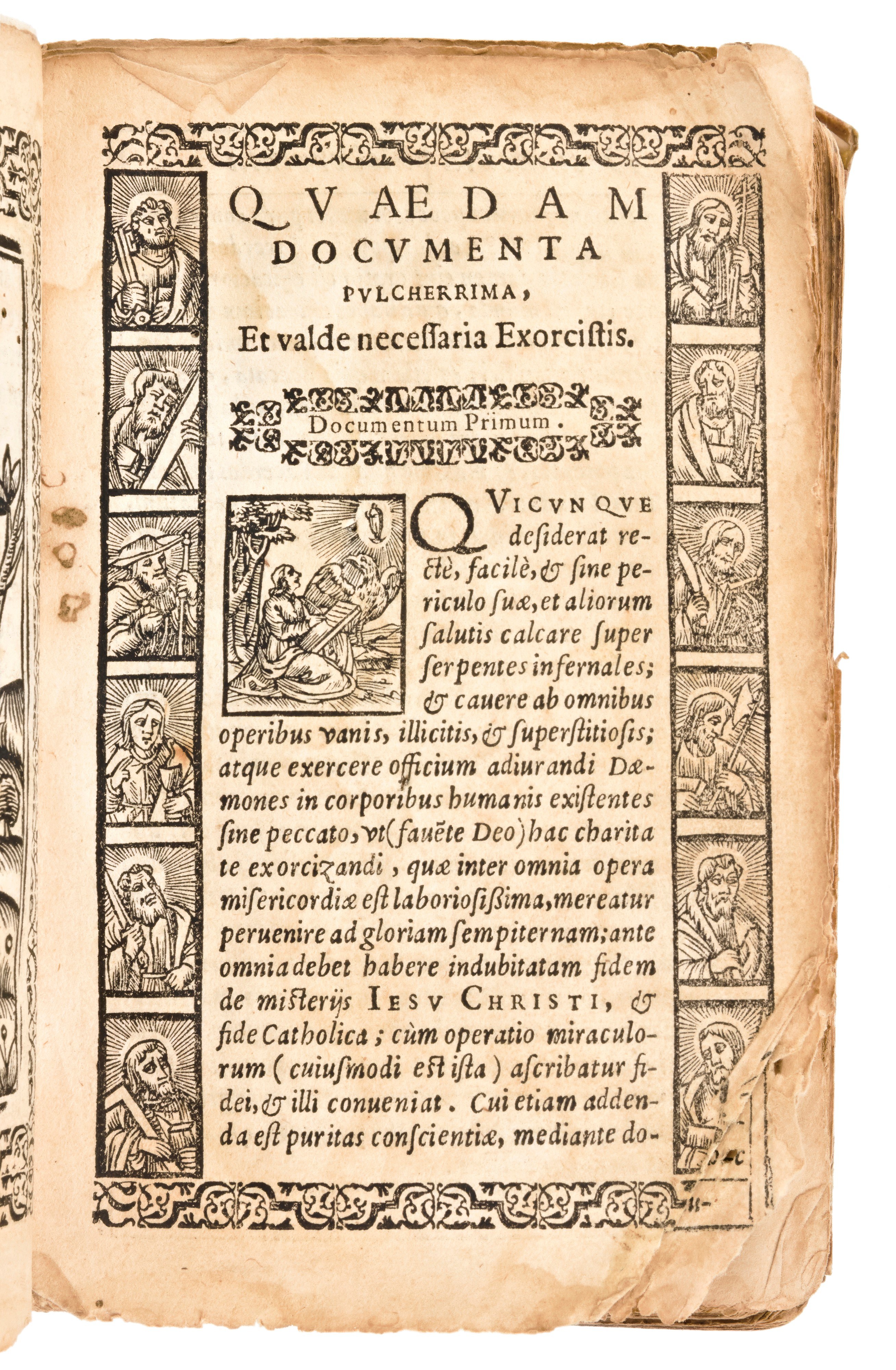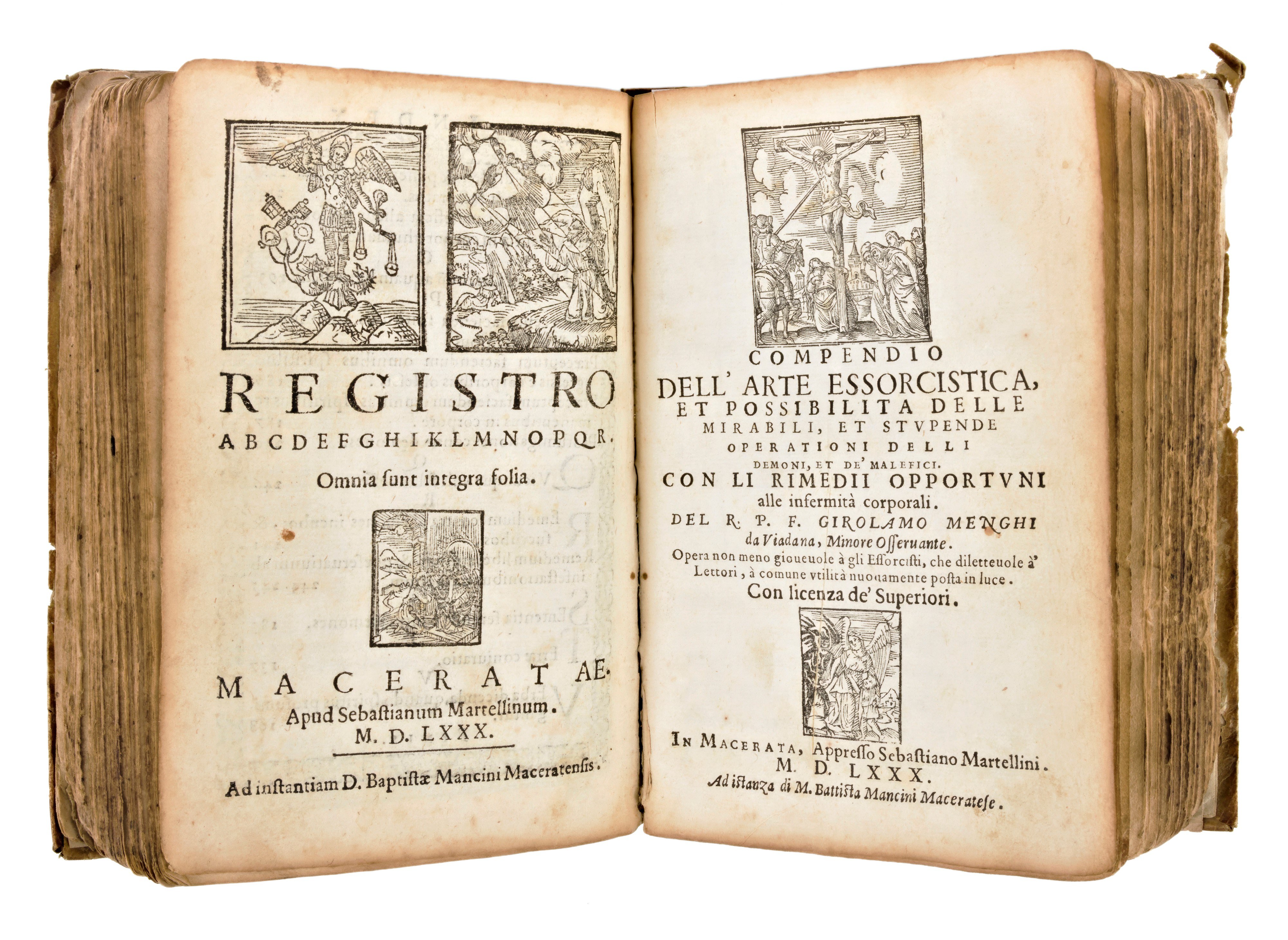 2 opere rilegate in un unico volume, dell'esorcista italiano Girolamo Menghi (1529-1609). In-8°, mm. 165x110, pp. 251, (21), 320, (10). Rilegatura coeva in piena pergamena. Prima opera mancante delle carte A1 (Frontespizio) e A2. Piccola perdita di testo alla c. A3. Macchie e sporadiche fioriture. Antiche note manoscritte nel testo. Lavoro di tarlo ai risguardi. Mancanza della pergamena al piatto posteriore e parte del dorso. Testo entro cornice, capilettere e testatine xilografici.