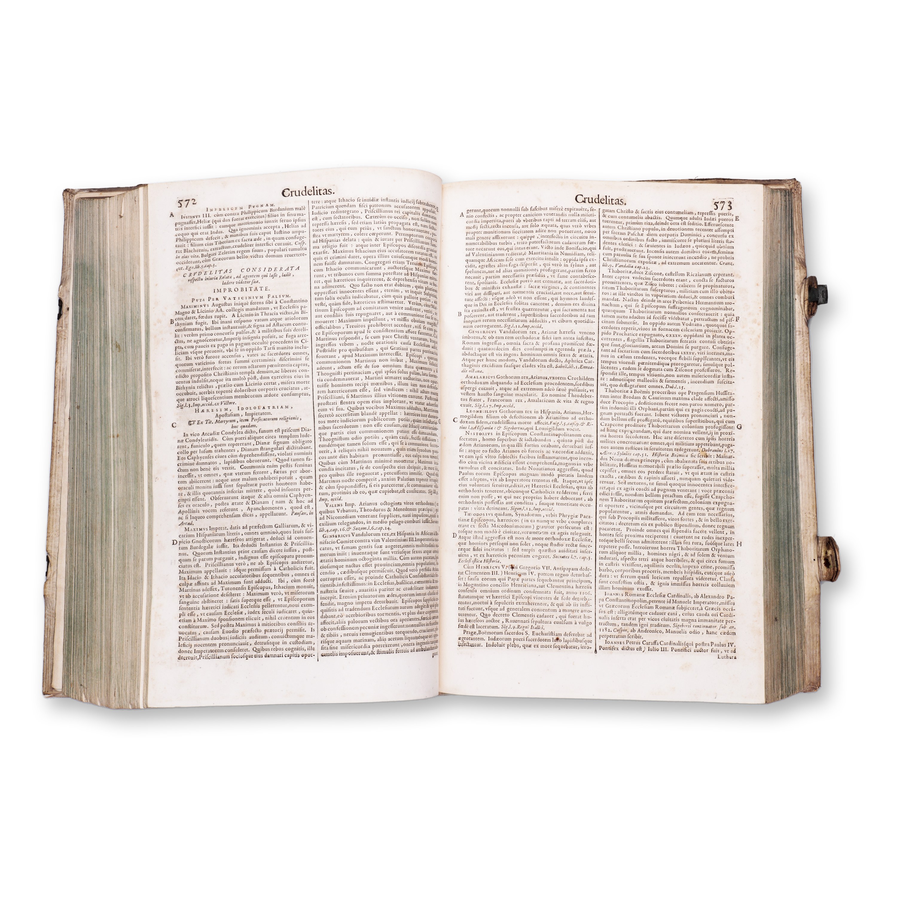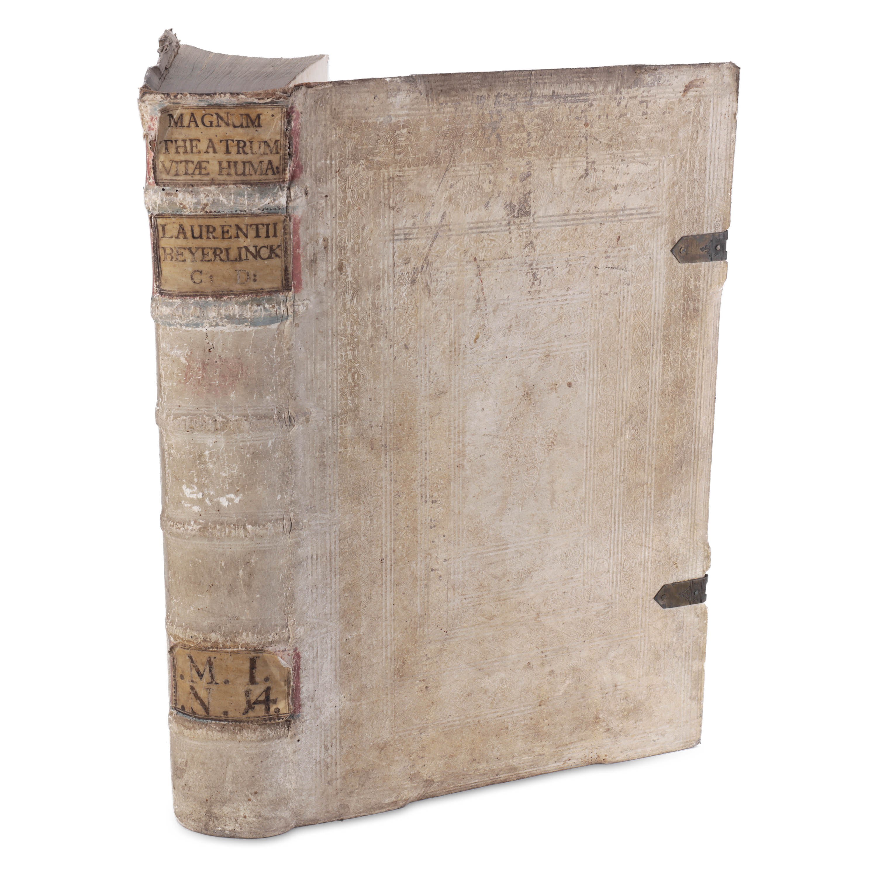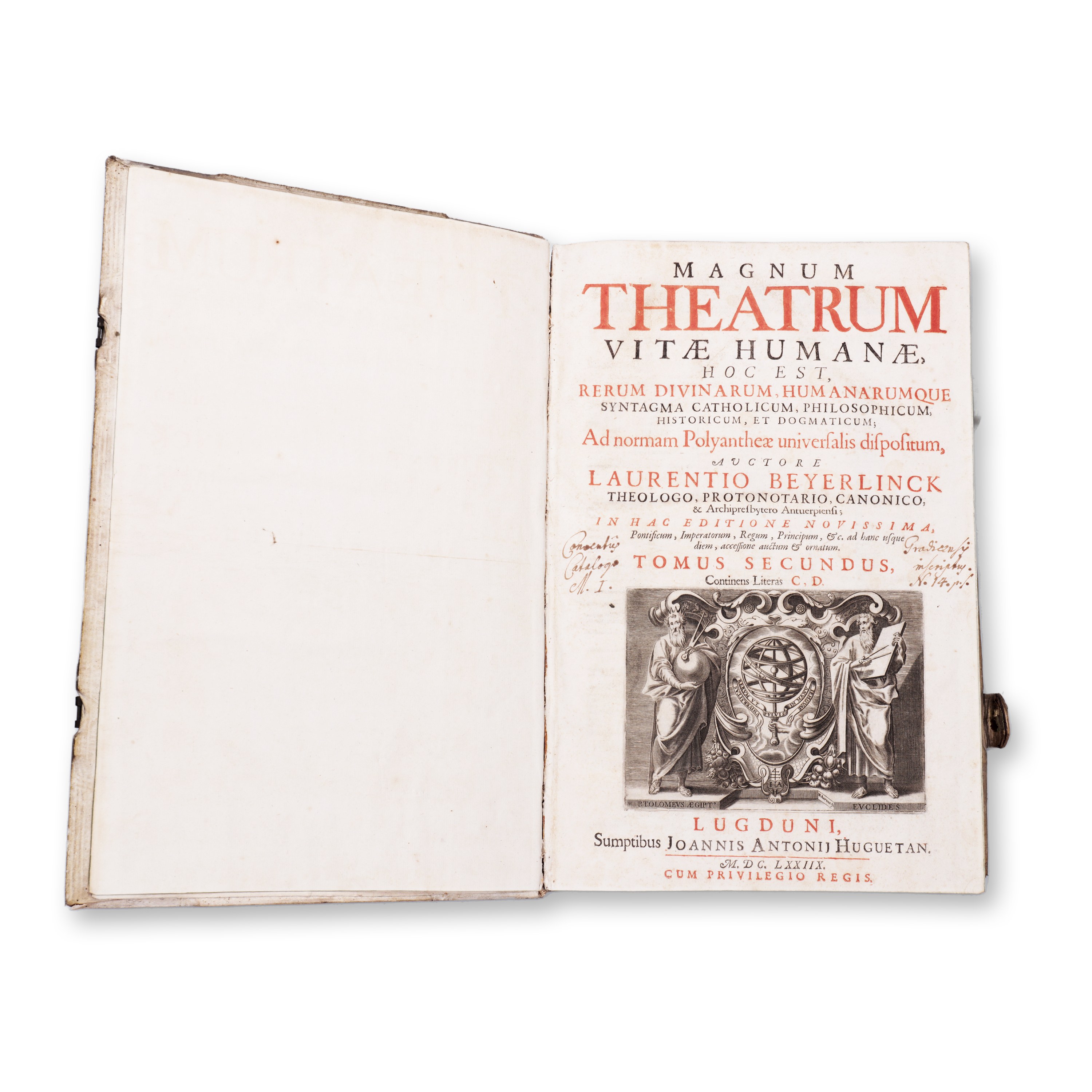 1678 | PUBLISHER: Lugduni, Joannis Antonij Huguetan | NUMBER OF PAGES: 1080 | LANGUAGE: Latin | DIMENSIONS: 385 x 260 mm | THE FULL TITLE OF THE WORK: Magnum theatrum vitae humanae. Hoc est rerum divinarum, humanarumque syntagma catholicum, philosophicum. historicum, et dogmaticum; Ad normam Polyantheae universalis dispositum. (Editio novissima). Tomus Secundus | NOTE: ex libris Ferdinandus Schröffel de Schröffelhaim | CONDITION: one edge clasp missing, light insect damage, spots, spine damaged at top