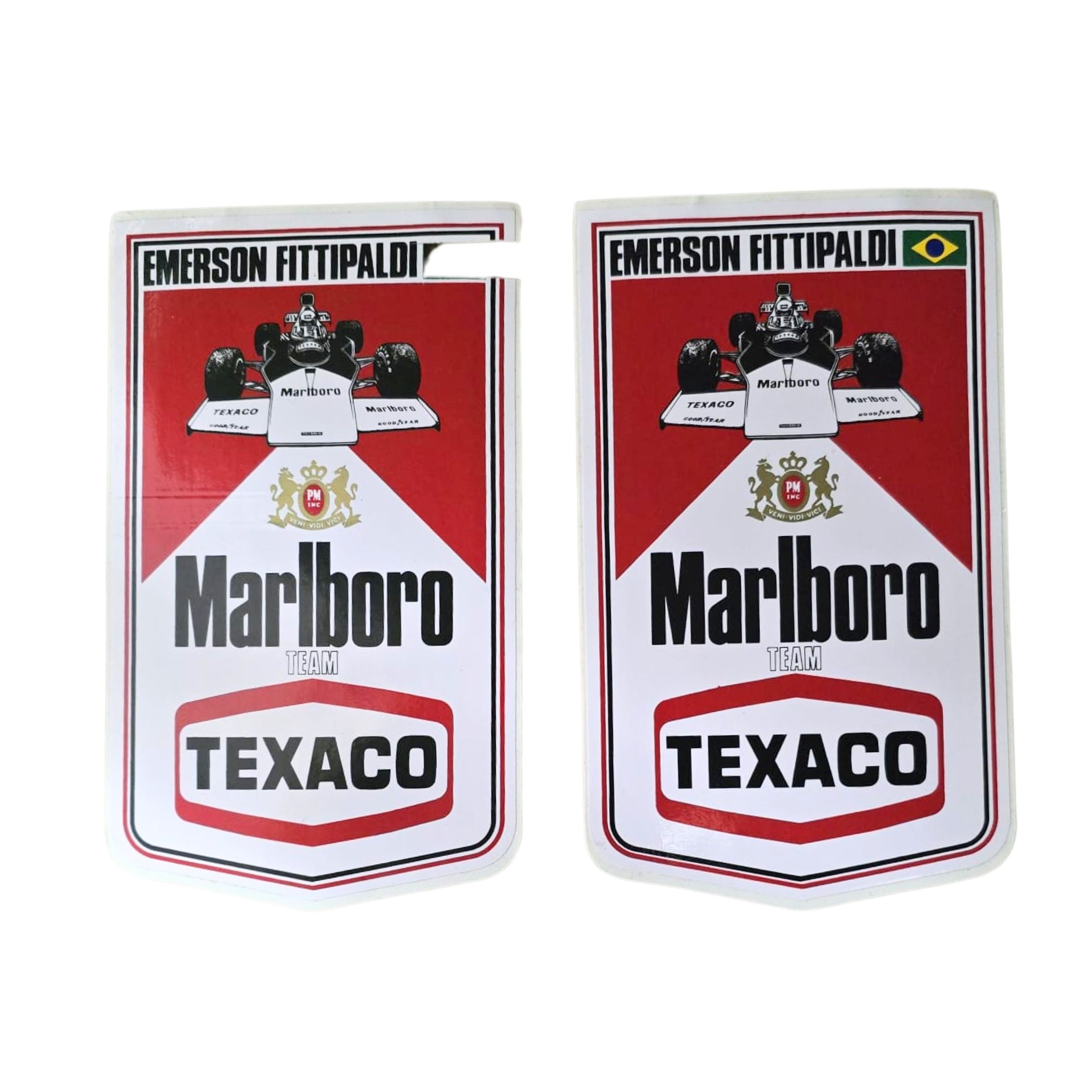 Zestaw dwóch identycznych naklejek vintage (1 naklejka uszkodzona jak na zdjęciu), Formuła 1 Team Marlboro TEXACO, kierowca Emerson Fittipaldi.
