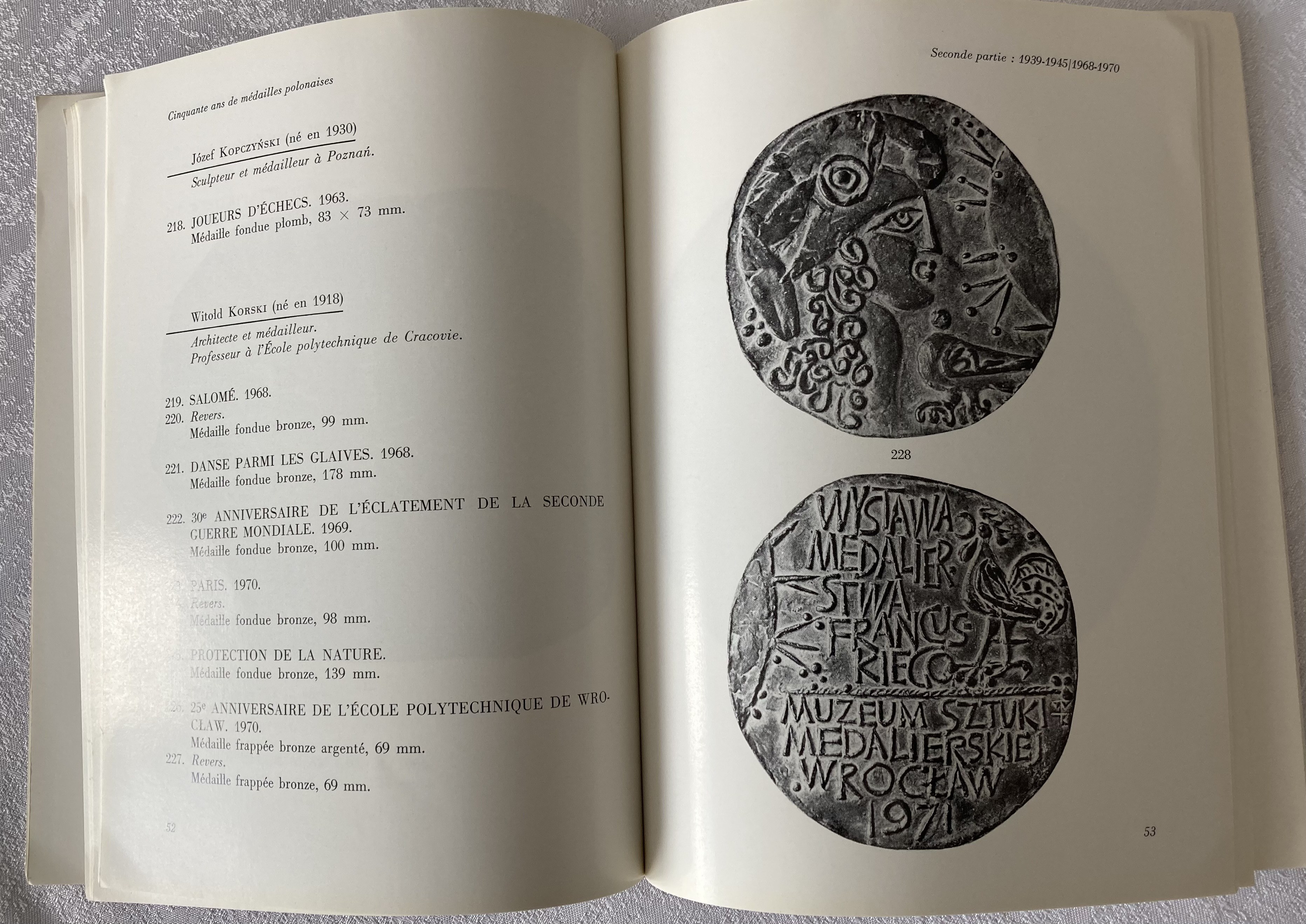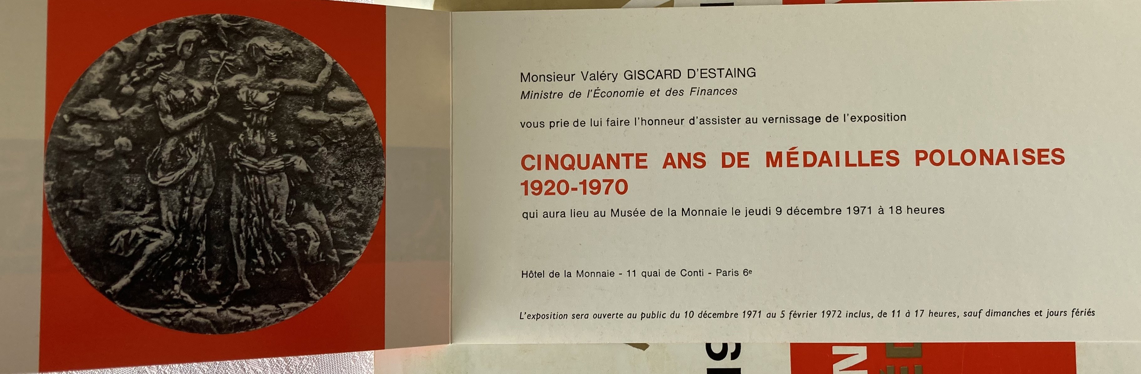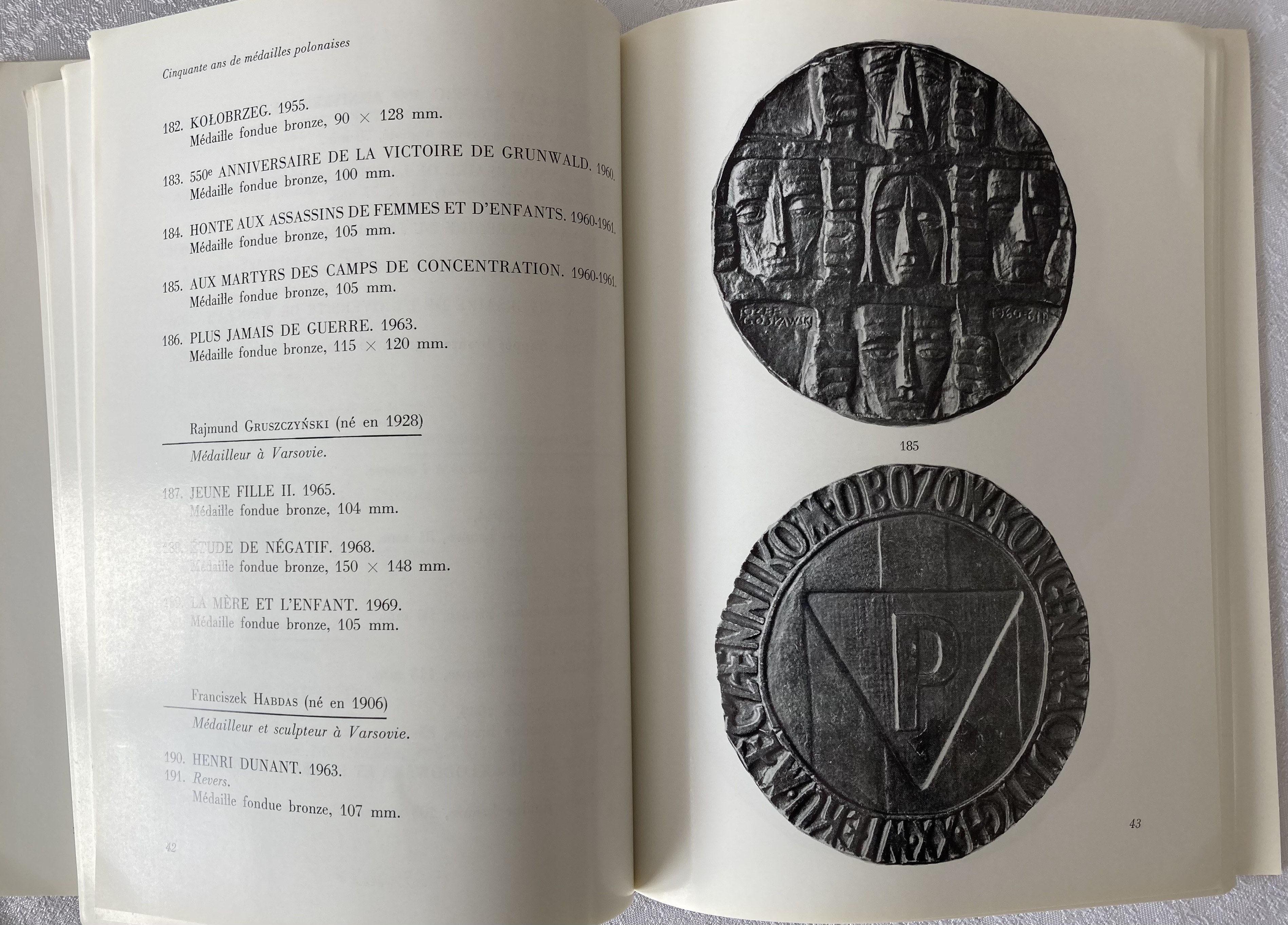 Katalog medali z wystawy w Paryżu, która odbyła się z okazji 50-lecia medalierstwa polskiego w niepodległej Polsce. Katalog ma 101 stron, liczne zdjęcia medali, dziś często nieznanych. Na wystawie zaprezentowano 358 medali autorstwa Polskich medalierów. Katalog wydany na papierze kredowy. Format 18 x 24 cm. Ciekawostką jest dołączone do katalogu zaproszenie dla dwóch osób wystosowane przez Valery Giscard D'estaing, wtedy Ministra Ekonomii i Finansów a później (w latach 1974 - 1981) prezydenta Francji.