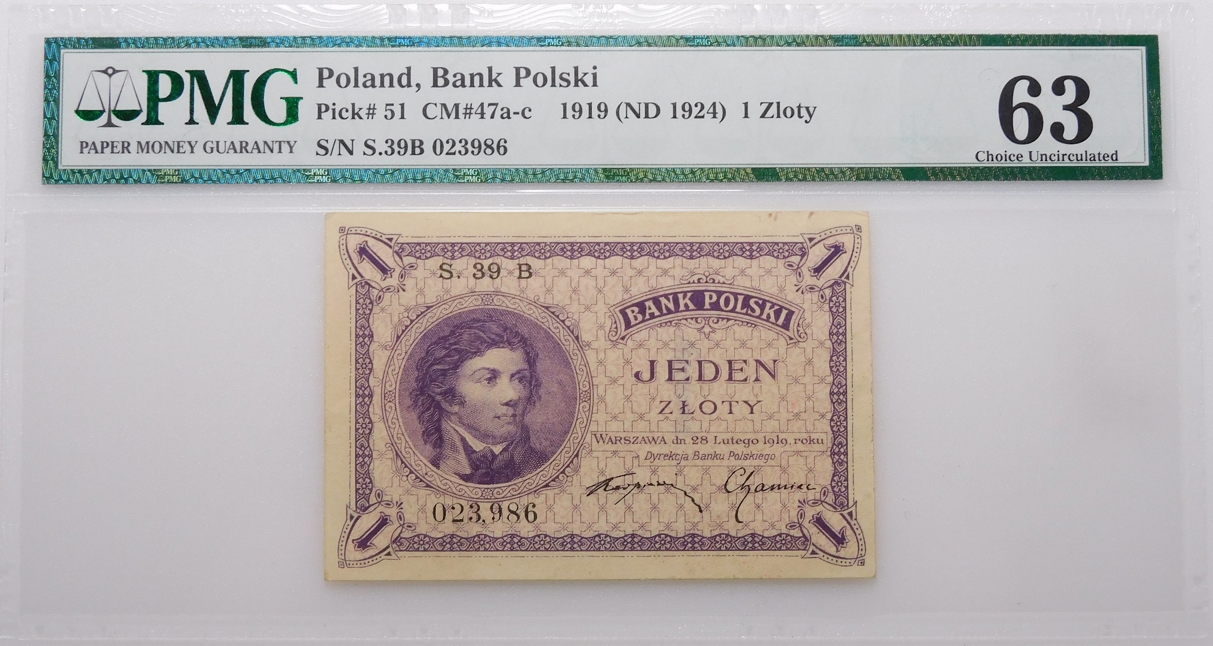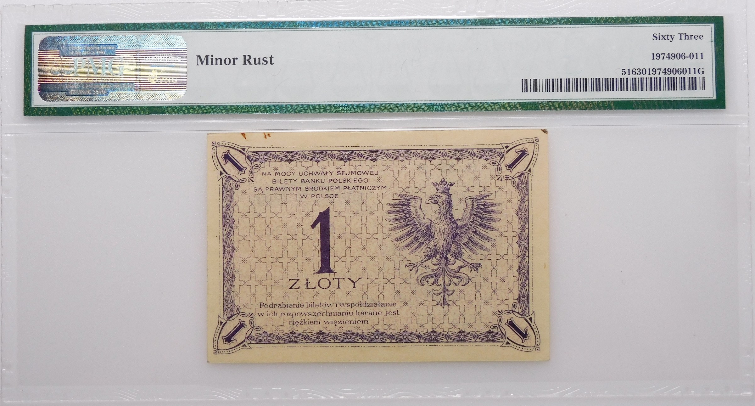 Ładny egzemplarz, potwierdzony solidną notą gradingową PMG. Banknot w naturalnym stanie zachowania, o bardzo dobrej prezencji. To co miało wpływ na ocenę gradingową - na rewersie, po lewej stronie, na górnym marginesie jest delikatny rdzawy ślad od spinacza, który po stronie awersu jest mniej widoczny, jedynie na samej górnej krawędzi banknotu - stąd adnotacja PMG.