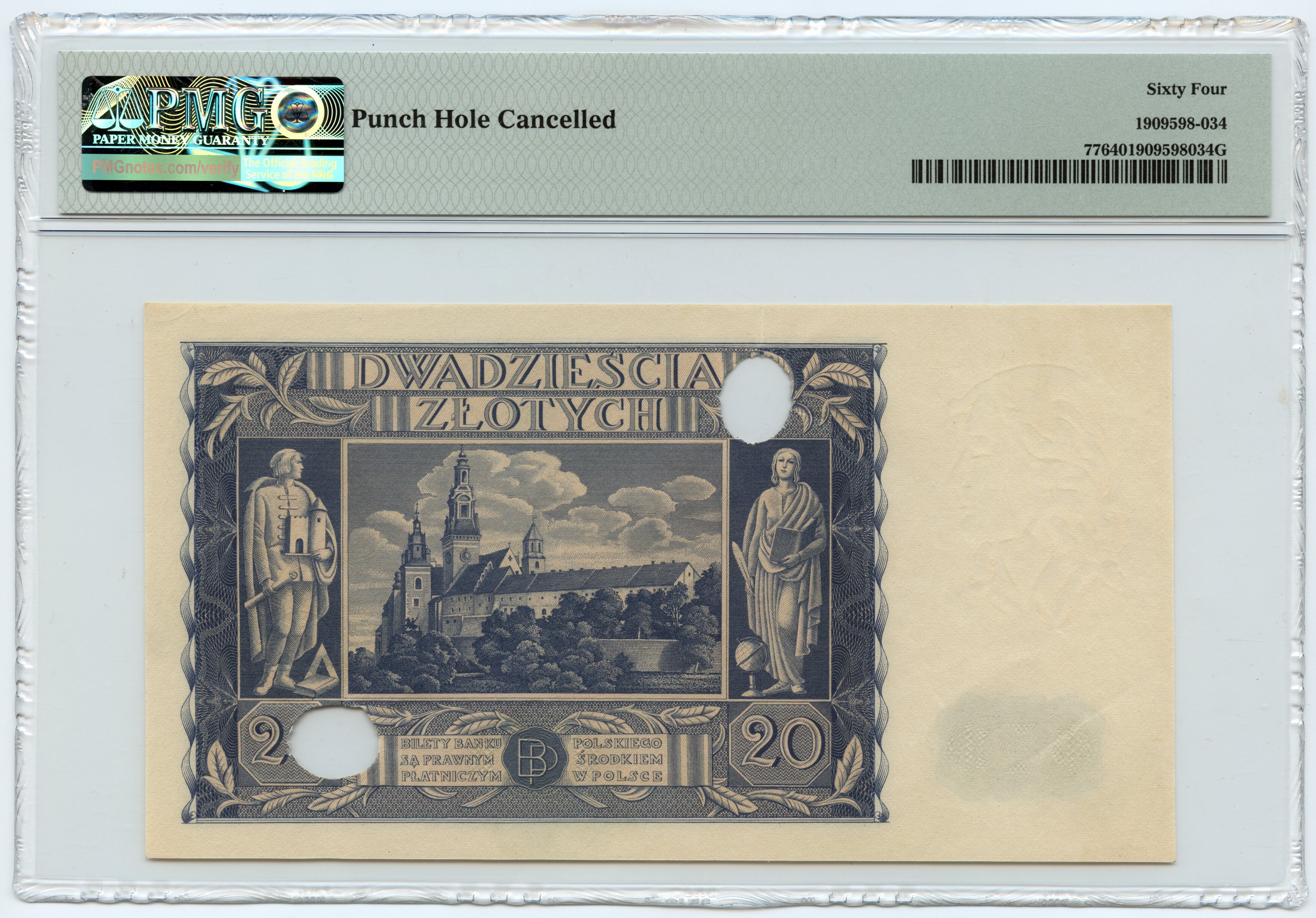 Banknot wydrukowany prawidłowo, skasowany oryginalnie podwójną perforacją.