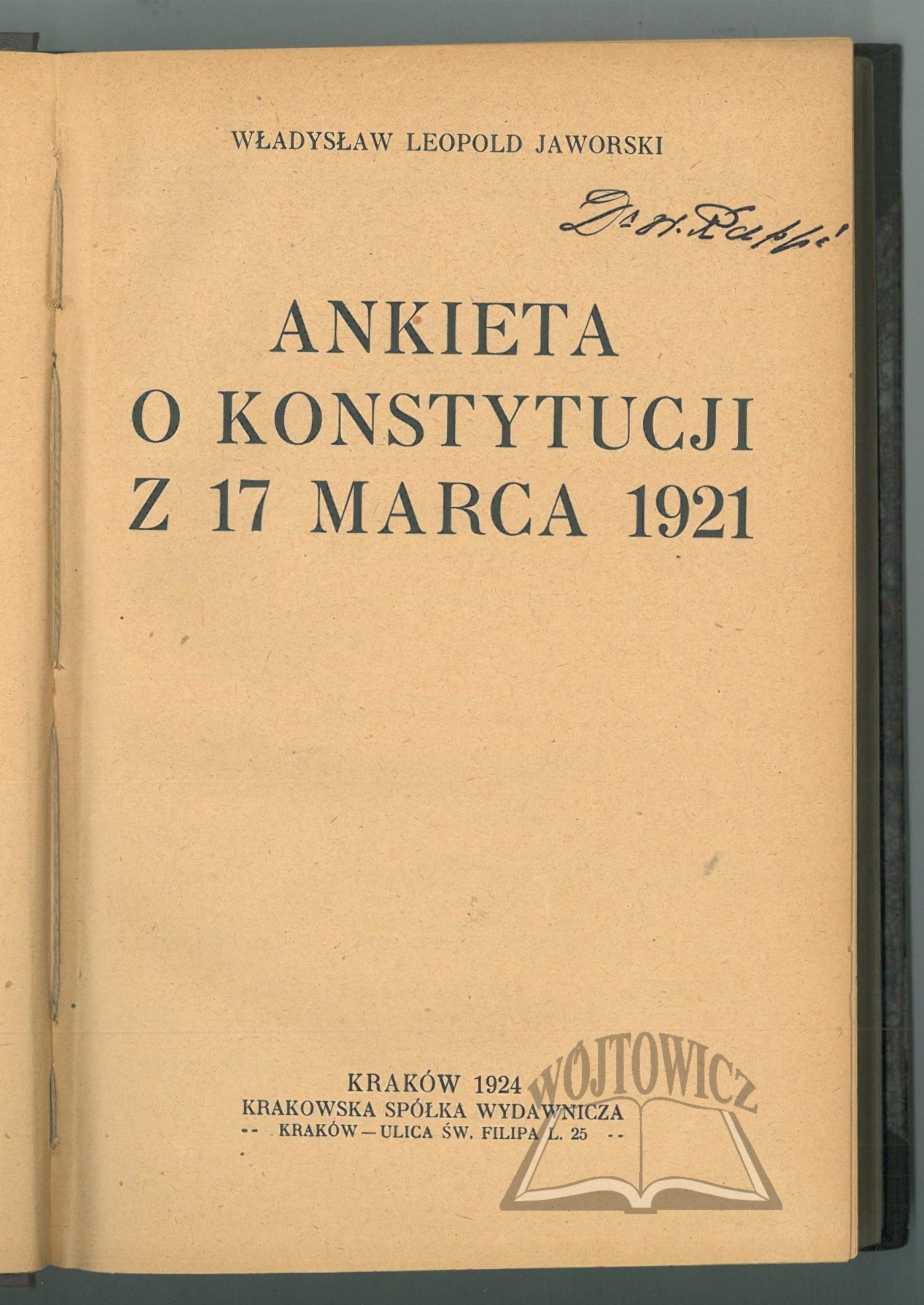 Zażółcenia wyklejek i niektórych kart, poza tym stan dobry. Podpis własność. Niniejsza praca jest komentarzem do Konstytucji w oprac. i opiniach ówczesnych prawników i polityków.