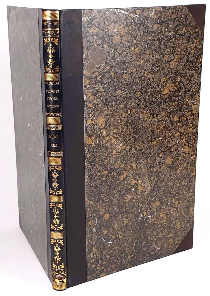 TWARDA OPRAWA PÓŁSKÓREK WSPÓŁCZESNY STYLIZOWANY NA ZBYTKOWNĄ OPRAWĘ Z EPOKI, GRZBIET ZE ZWIĘZAMI, TŁOCZENIAMI I DEKORACYJNYMI ZŁOCENIAMI. KARTON MARMORYZOWANY