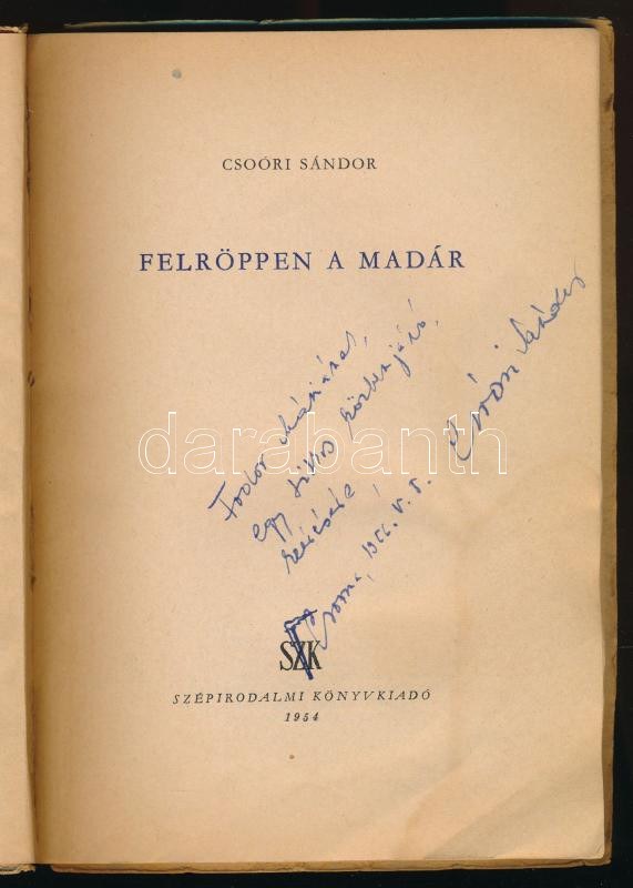 Csoóri Sándor: Felröppen a madár. DEDIKÁLT! 1954, Szépirodalmi. Kiadói papírkötés, lapokon ázásnyomok, borítón szakadások.