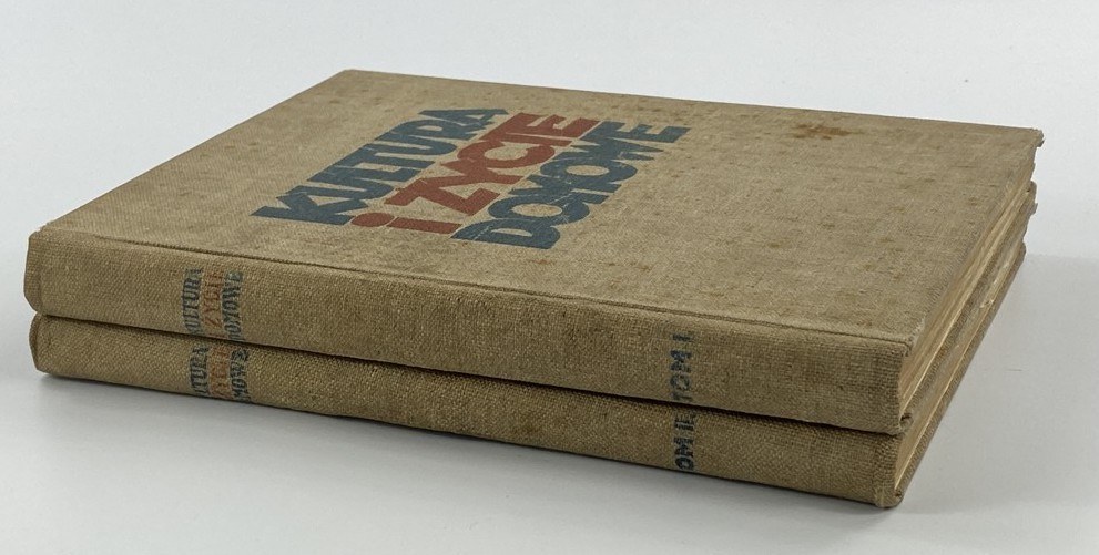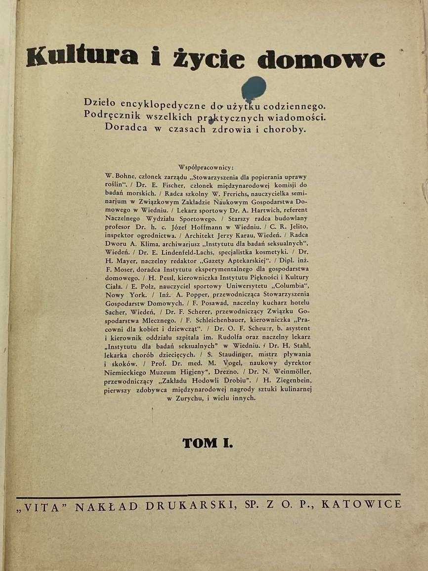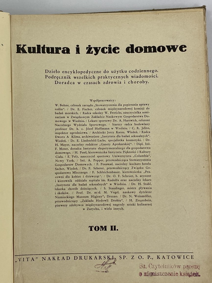 Kultura i życie domowe: dzieło encyklopedyczne do użytku codziennego: podręcznik wszelkich praktycznych wiadomości: doradca w czasach zdrowia i choroby. T. 1-2, Vita, Katowice [1935], s. 304, [11] k. tabl., [2], 305-516, [15] k. tabl., wymiary 20 x 26,5 cm. Nieakt. pieczęcie własności. Komplet kolorowych tablic. W tomie II luźna karta (naddarcia karty). Okładki płócienne, wydawnicze. Zabrudzenia, otarcia okładek.