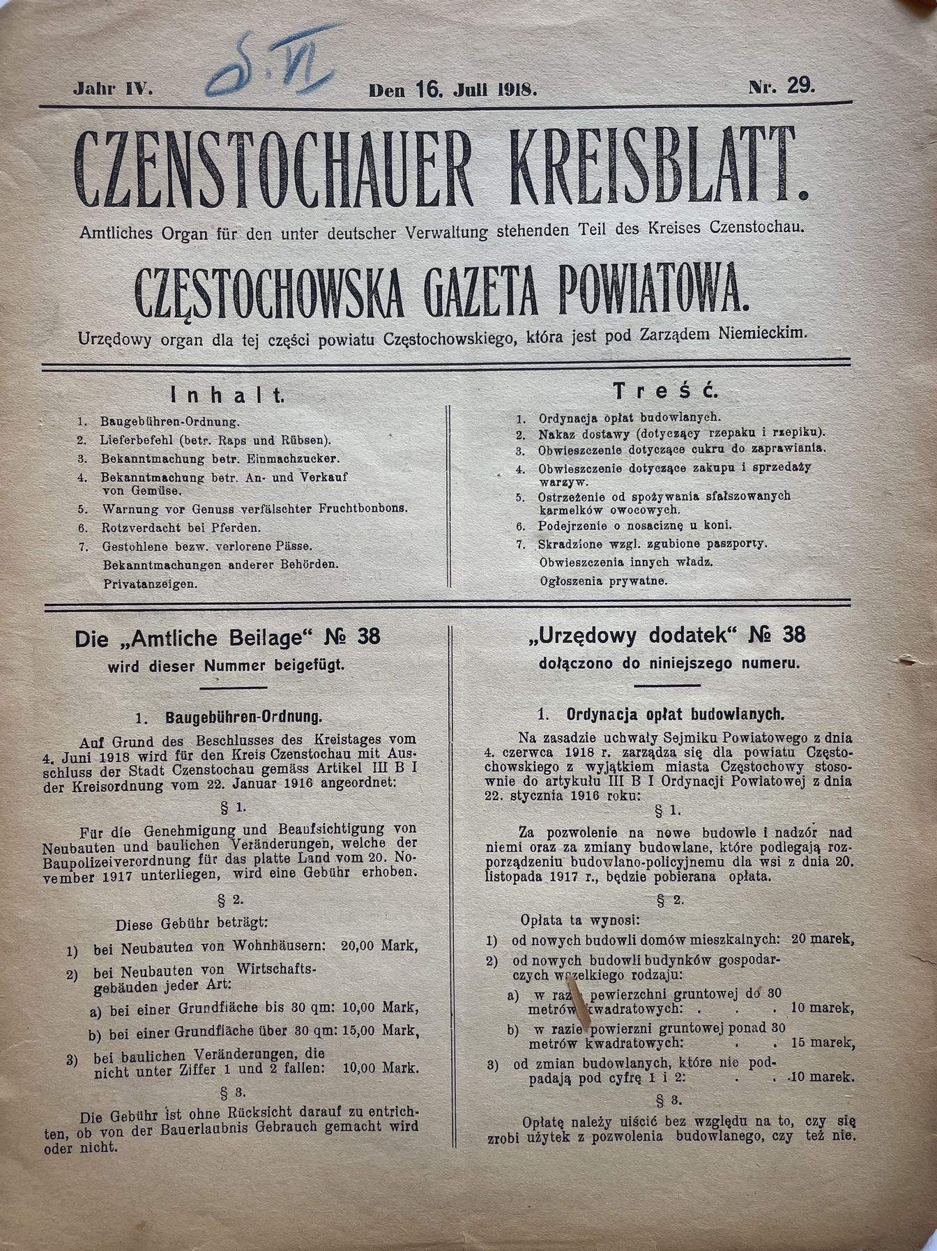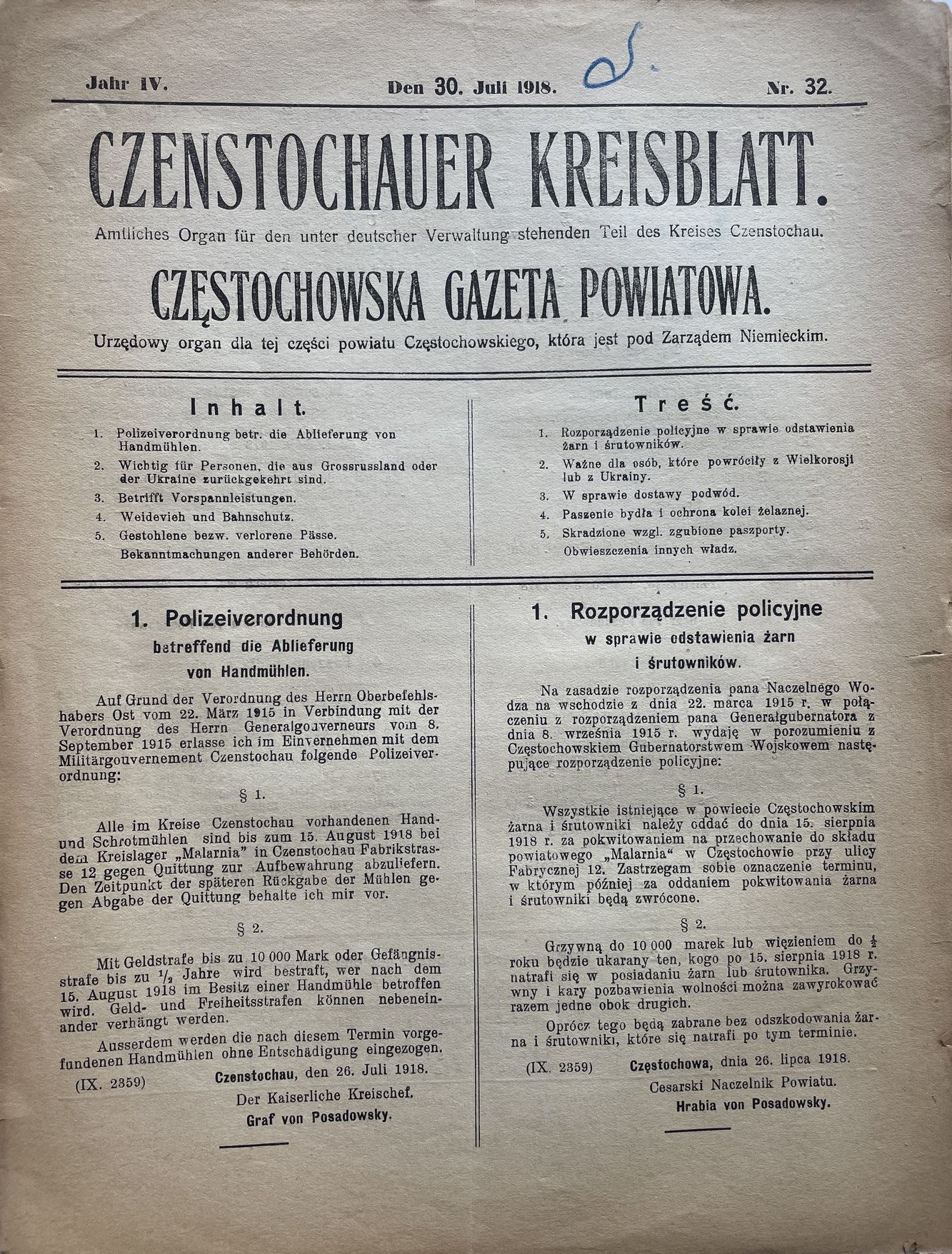 Częstochowska Gazeta Powiatowa. Rok 1918 nr 28, 29, 32, 45, 46 i trzy urzędowe dodatki (nr 37, 38 i 43), równolegle tekst niem. i polski. Format 32 cm, każdy nr ca 4-8 str.