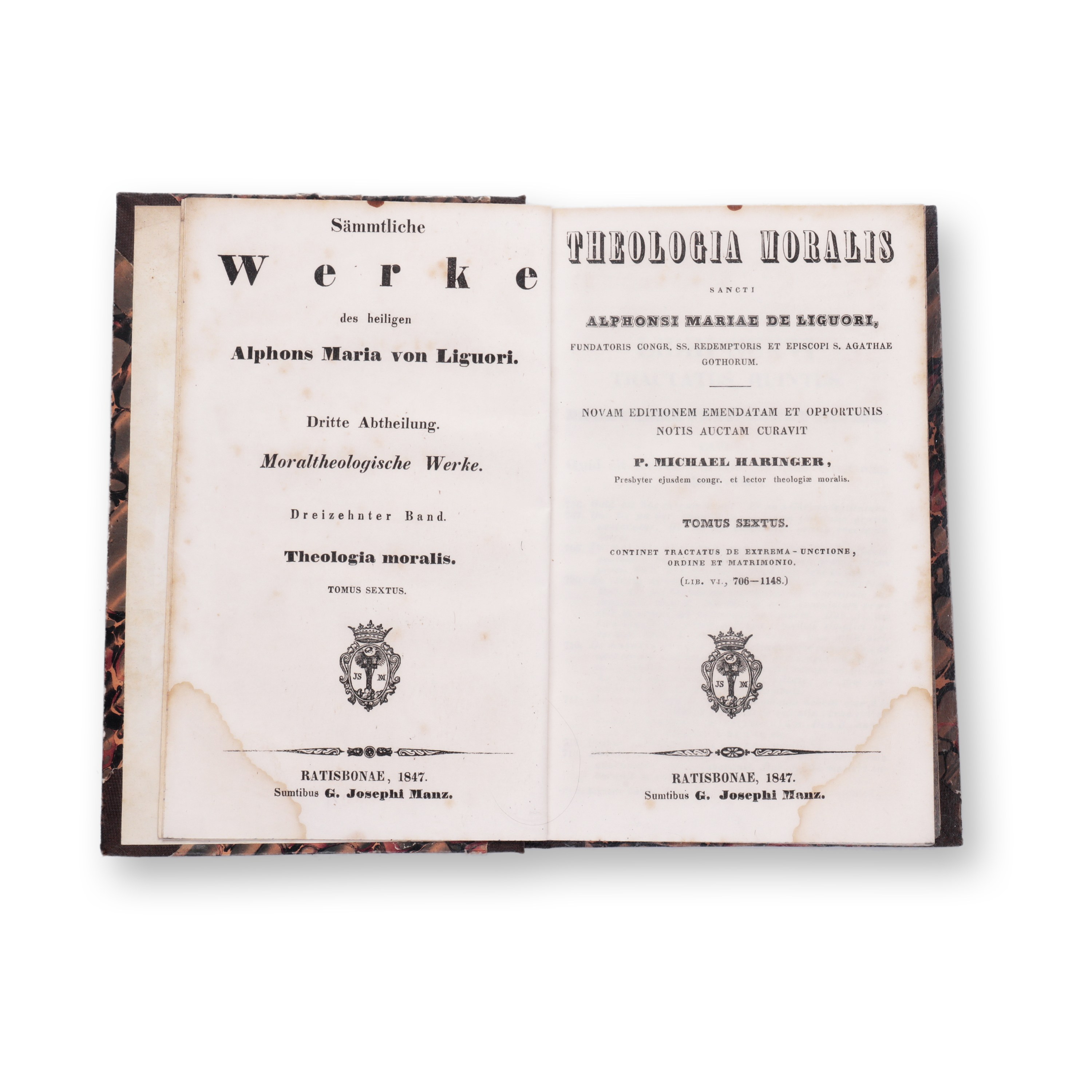 1847 | PUBLISHER: Regensburg, Georg Joseph Manz | NUMBER OF PAGES: 481 | LANGUAGE: Latin | DIMENSIONS: 168 x 115 mm | THE FULL TITLE OF THE WORK: Theologia moralis. Tomus sextus | CONDITION: spots, damp stains