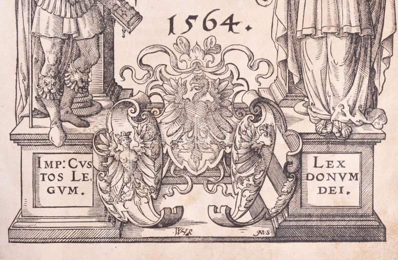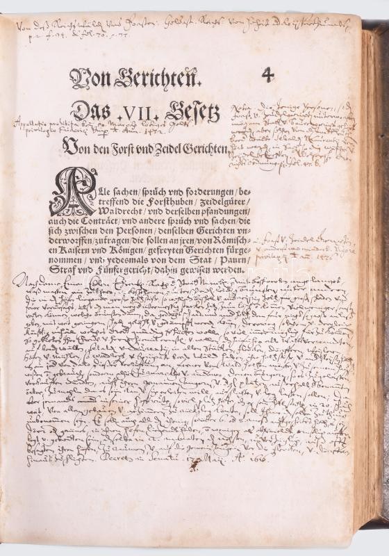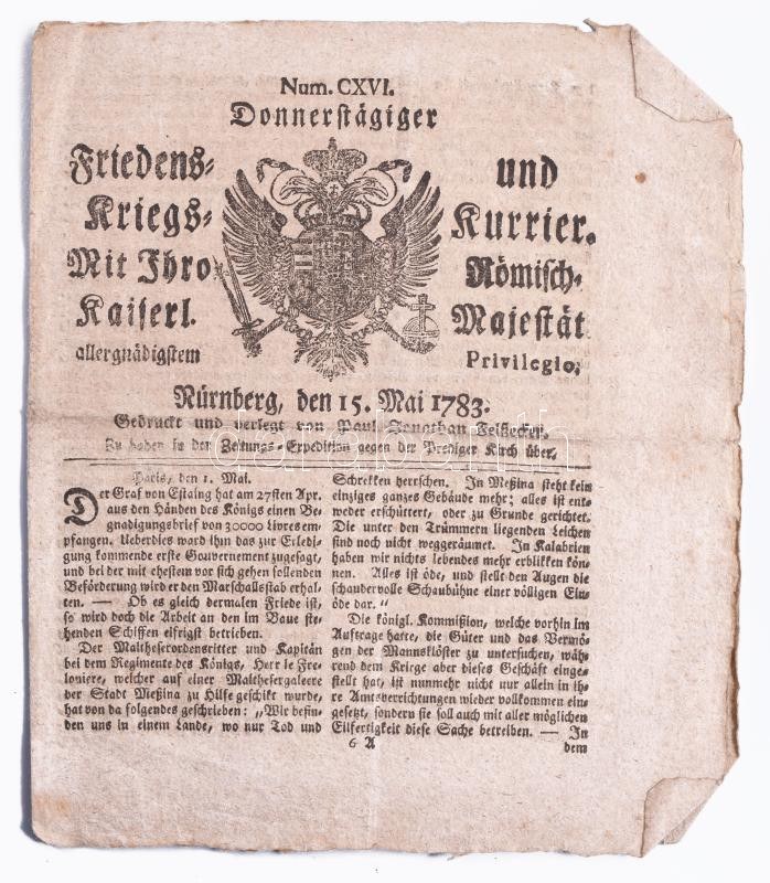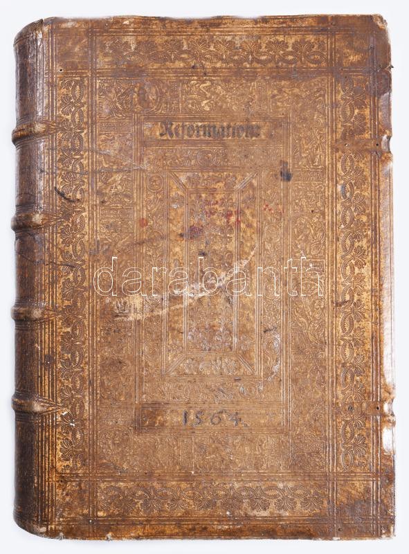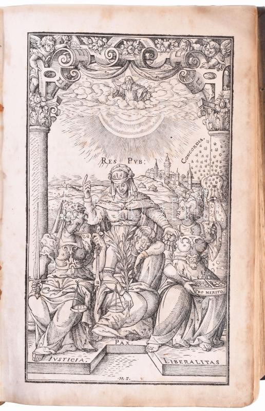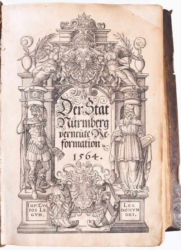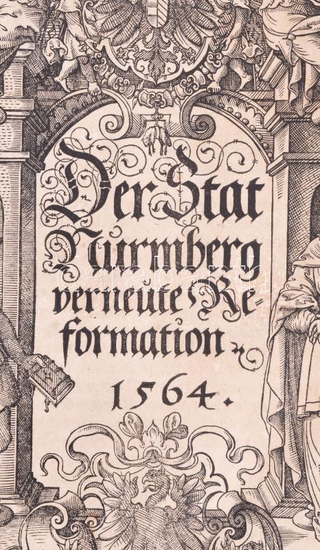 Der Stat Nürmberg verneute Reformation. Nürmberg [Nürnberg], 1564, Valentin Geißler, 1 (fametszetű díszcímlap) t.+ 2 sztl. lev.+1 (fametszet) t.+40 sztl. lev.+240 lev.+1+1+ 31 [korabeli kézzel írt jegyzetlapok] t. + 1 (fametszetű ábra, sérült) t. Német nyelven. Benne XVIII. század végi folyóiratokkal: 1777-1789 Friedens- und Kriegs-Kurier 3 száma (Num. CCLX (1777. okt. 30), Num. CXVI (1783. május 15.), Num. CLXXXII (1789. július 31.) Nürnberg, 1777-1789, Paul Jonathan Felßecker,német nyelven. 3x2 sztl. lev. Eredeti XVI. századi egészbőr-kötésben, kötéstáblákon keretben: körben növényi ornamentikus díszítéssel, utána szintén körbe figurális díszítésekkel, alattuk feliratokkal, utánuk növénydíszes ornamentkában medalionokkal, bennük arcképekkel, végül szintén növényi ornamentikával, továbbá a borítón keretben "Reformation" és "1564" feliratokkal, kopott, foltos borítóval, a borítón karcolásokkal, és apró lyukakkal, a fém kapcsok hiányoznak, a hátsó táblán (a hiányzó kapcsok mentén), a gerinc felső részén, és a felső sarkokon sérülésekkel, a címlap felső sarkán hiánnyal, a legutolsó lap és a metszet (222-223. lev között) sérült, az elülső szennylapon kis sérüléssel, rajta több korszakból származó bejegyzésekkel, foltos lapokkal, a lapokon bejegyzésekkel, jegyzetekkel, (felthetőleg egy kéz munkái kb. a XVI. sz. végéről/XVII. sz. elejéről), a könyv végén egy kéz általi jegyzetekkel (feltehetőleg XVI. sz. vége/XVII. sz. eleje.) Modern védőtokban, belül bársony védőborítással. Rendkívül ritka, a borítója igazi műremek!